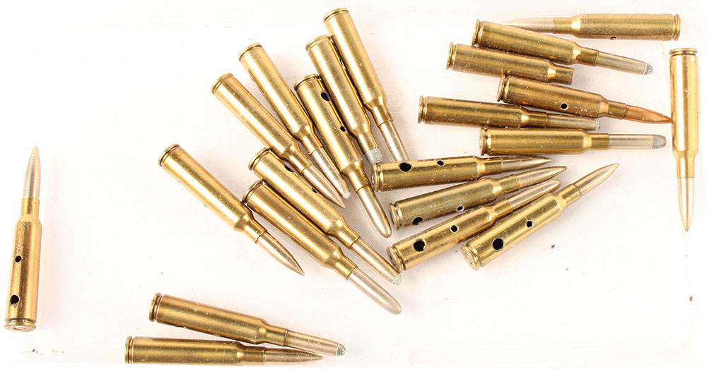 Lot of 21, 6.5x55mm ''Swedish'', A mixed lot of(12) military and (9) commercial rounds, various manufacturers including two DWM numbers.(letter) codes. All have two non factory holes. Grade: Very Good ++ - Value: 10 to 20