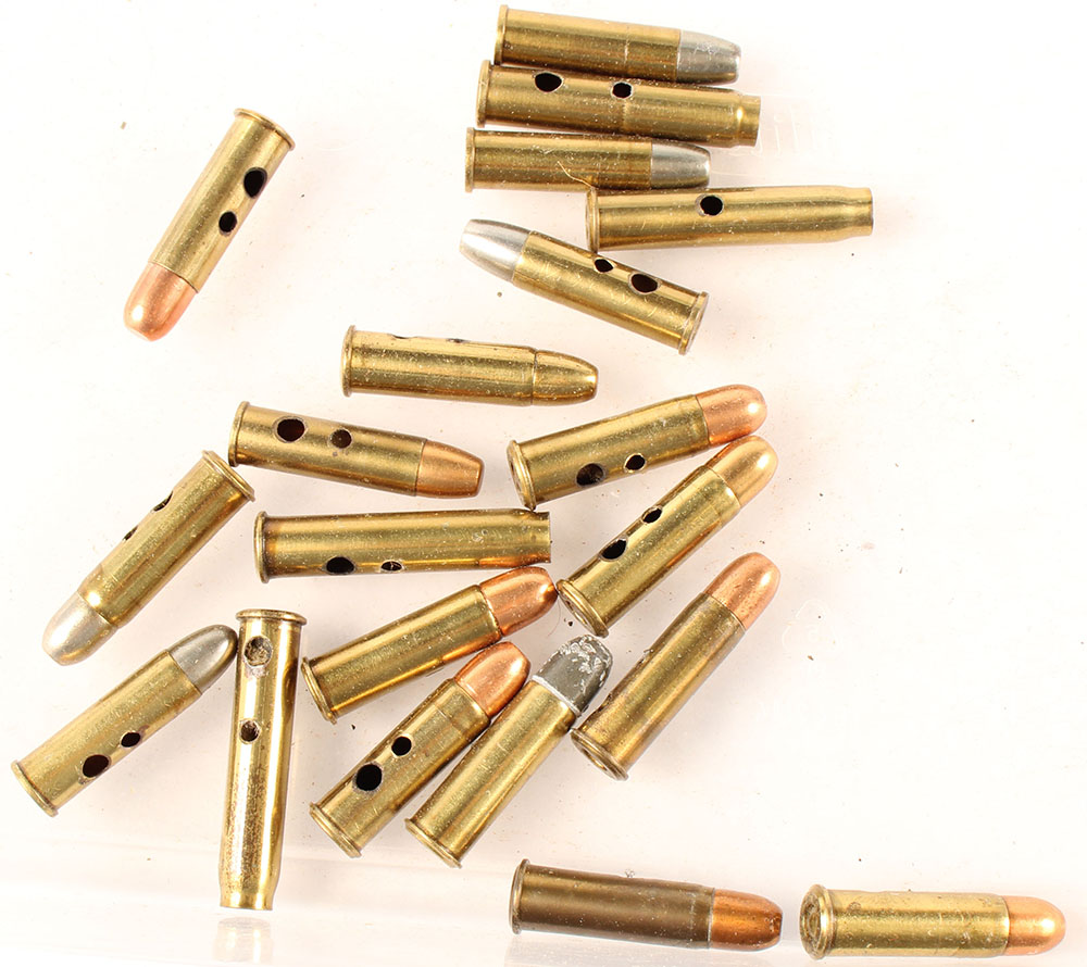 Lot of 19, metric calibers. (11) 8mm Lebel Revolver: 1--HS:''S.F 35 S.F 4'', FN CJ FMJ. 1--HS:''FIOCCHI LEBEL CAL. 8'', FN Brass FMJ. 1-- NHS, FN CJ FMJ. 1--HS:''SFM * GG *'', FN CN FMJ. 1--HS:''SFM * G *'', FN CJ FMJ. 1--HS:''LEBEL MOD 92'', FN Lead. 1--HS:''LEBEL MOD. 92 RWS'', FN CJ FMJ. (5) 8mm Rast Gasser Revolver: 1--HS:''Z / * / 8RG / * /'', FN CJ FMJ. 1--HS:''I / 18 / GR / 19'', RN CN FMJ. 1--HS:''II / 16 / SB / 19 /'', FN CN FMJ. 1--HS:''I / 16 / GR / 19 /'', FN CN FMJ. 1--HS:''VI / 15 / SB / 19 /'', FN CN FMJ. (1) HS:''ECP / 14 / M / 4 /, FN CJ FMJ. (1) HS:''ECP / 13 / H / 1 /'', FN CJ FMJ. (1) HS:''ECP / 06 / BS / 3 /'', FN CJ FMJ. (1) HS:''G&C D LEBEL D'', FN CJ FMJ. (4) 8mm Pieper: 1--HS:''U.M.C. PIEPER'', Round Ball below case mouth. 1--HS:''U.M.C. PIEPER'', FN CN below case mouth. 1--HS:''REM-UMC 8m/m PIEPER'', FN CN below case mouth. 1--NHS, FN CN below case mouth. All have one or two non-factory holes in case. Grade Very Good - Value: 10 to 40
