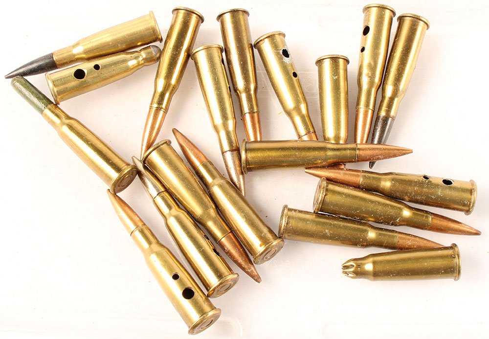 Lot of 19, 8mm Lebel, all Military. (13) Ball Loads, (2) Tracers, (1) AP, (2) Blanks, (1) Gallery> All have one or two non-factory holes in case body. Grade Very Good. - Value: 10 to 20