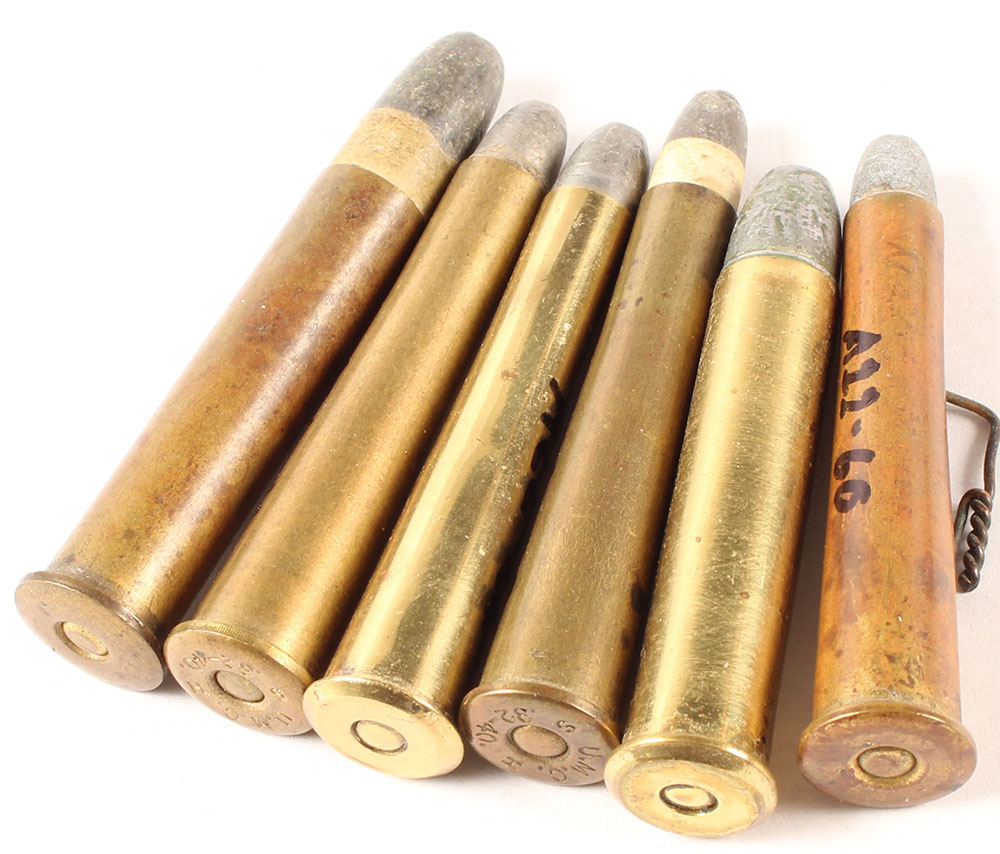 Lot of 6. Remington Cartridges. (4) .32-40 Remington Hepburn: 2-- HS:''U.M.C. H 32-40 S'', one FN Lead, one FN PP Lead. 2-- NHS. FN Lead. One is a board dummy with two mountain holes (wire still attached) and two punch crimps near mouth to hold bullet in place. (2) 40-45 Remington Mid-Range, NHS, 1--FN PP Lead. 1--FN Lead. Grade Very Good - Value: 30 to 60