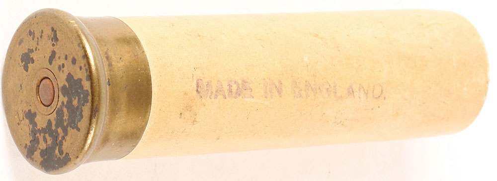 J.P.S. V, 4ga, loaded tan paper shot shell, 3 3/4'' OAL, shell is solid, hard to read blue top wad. Grade: Excellent - Value: 50 to 150