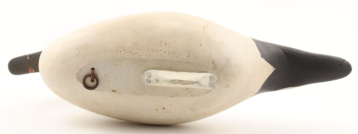 Pintail Drake by R. Madison Mitchell, Havre de Grace, MD, 1968, painted eyes, solid wood, original paint, partially repaired beak, tight hairline crack in neck, 18'' OAL. Grade: Good - Value: 50 to 100