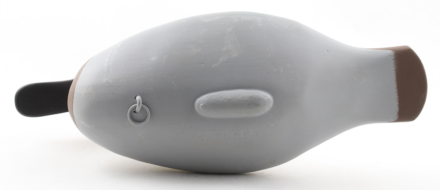 Canvasback Hen by Jeff Spencer, MD, painted eyes, solid wood, original paint, crack in neck, appears to be repaired with glued dowel, marked ''SPENCER'' on bottom, 16'' OAL. Grade: Excellent - Value: 40 to 80