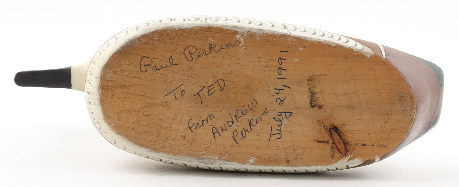 Woodduck Drake by Paul Perkins, 1991, glass eyes, solid wood, original paint, structurally excellent, 13'' OAL. Grade: Excellent - Value: 30 to 60