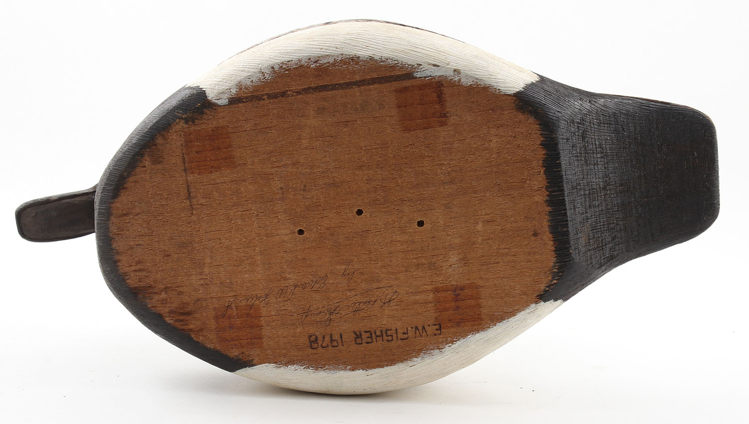 Bluebill Drake by E.W Fisher, 1978, glass eyes, solid wood, original paint, nice detail, structurally excellent, 16 1/2'' OAL. Grade: Excellent - Value: 40 to 80