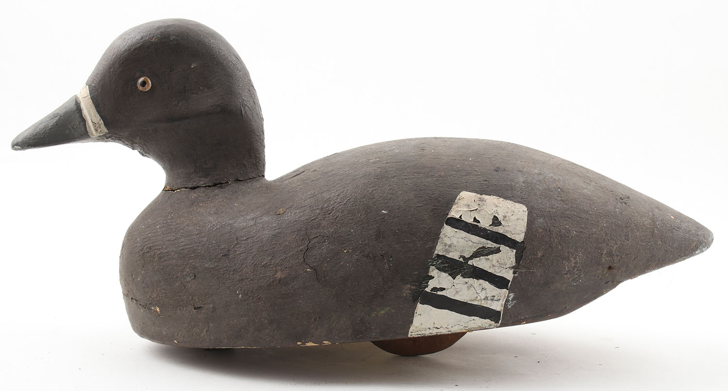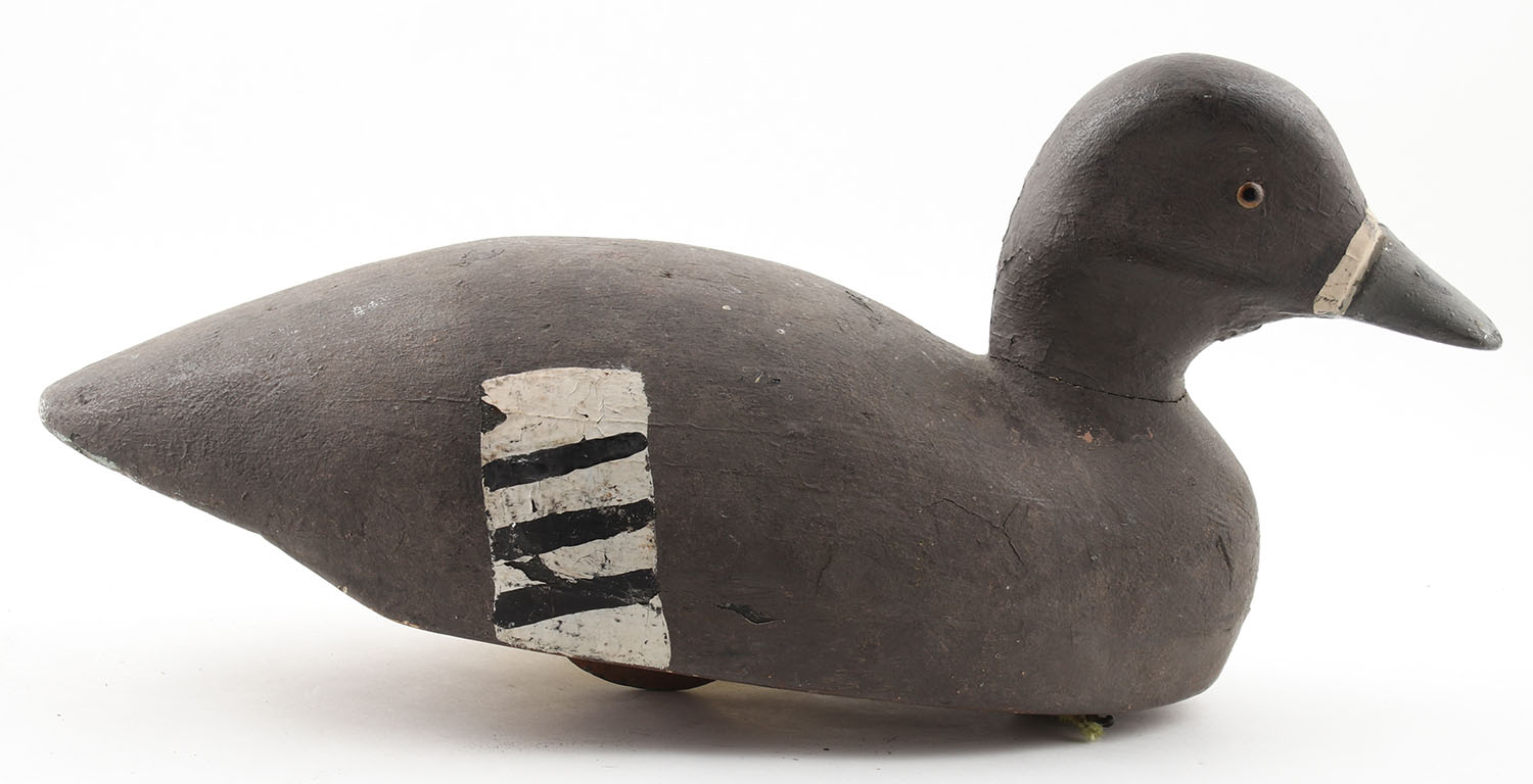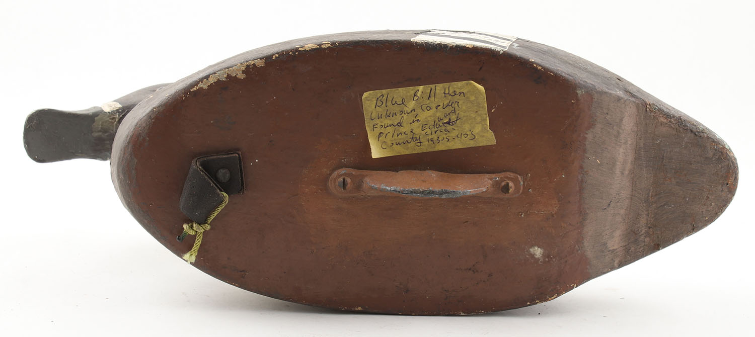 Bluebill Hen by Unknown Maker, circa 1940's, glass eyes, hollow wood, repaint, crack around base of neck, 16 1/2'' OAL. Grade: Good++ - Value: 10 to 40