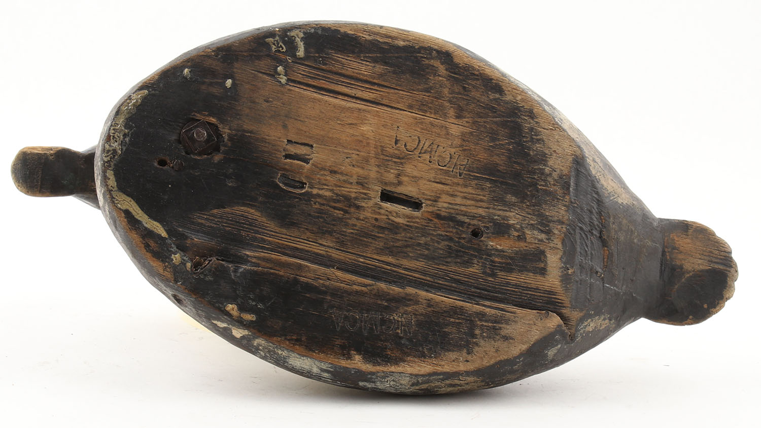 Bluebill Hen by N.C. MCA, glass eyes, solid wood, repaint, head & body separated, structurally sound, 13'' OAL. Grade: Good - Value: 10 to 50
