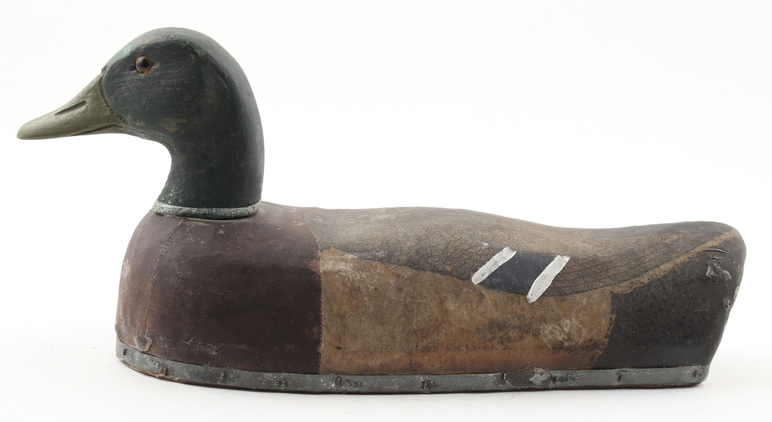 Early Mallard Drake by Herter's Decoy Co., Waseca, MN, glass eyes (have small cracks), painted canvas over wood or cork?, metal band around bottom, original paint, structurally excellent, wax layer on bottom, 14'' OAL. Grade: Very Good++ - Value: 100 to 400