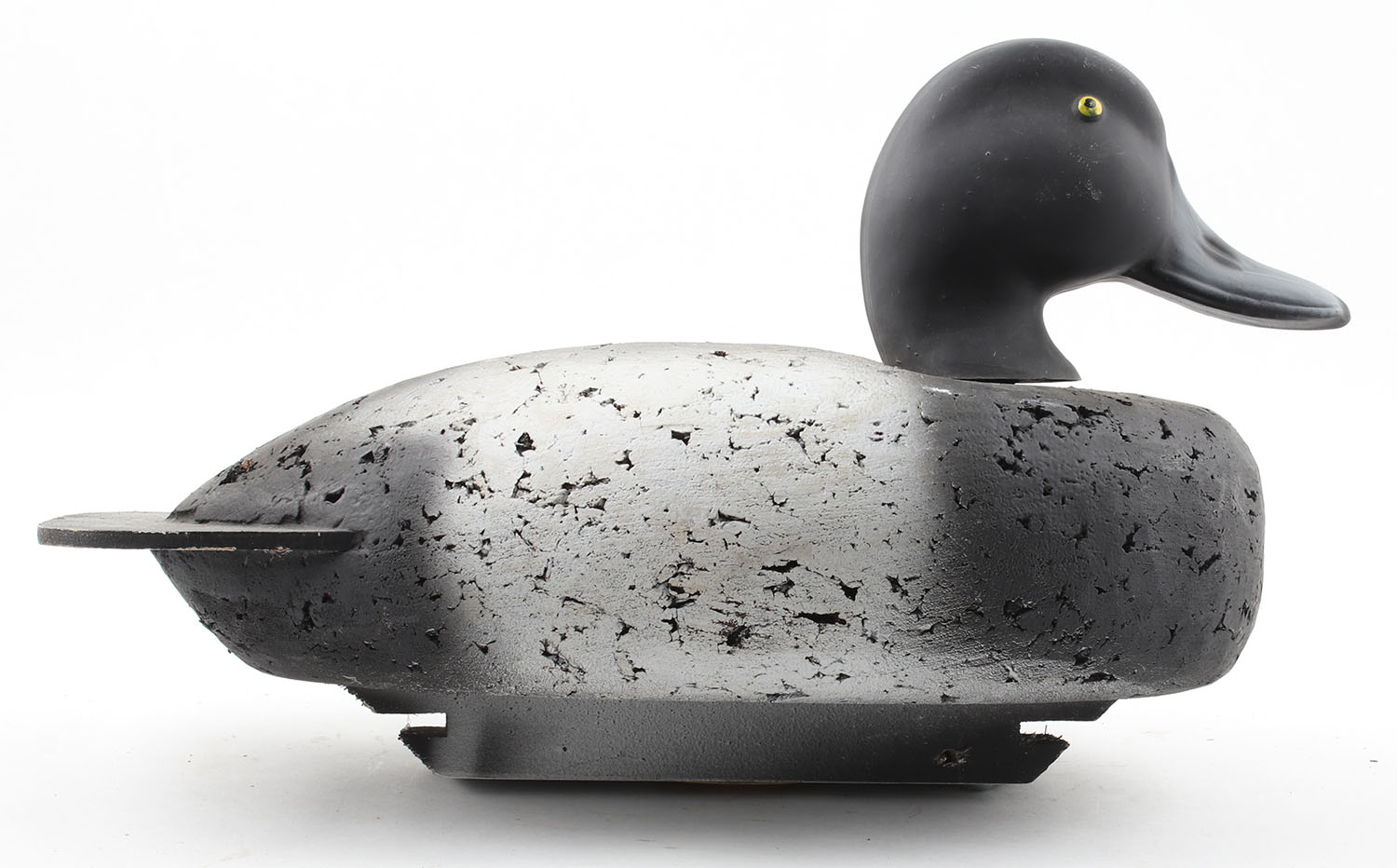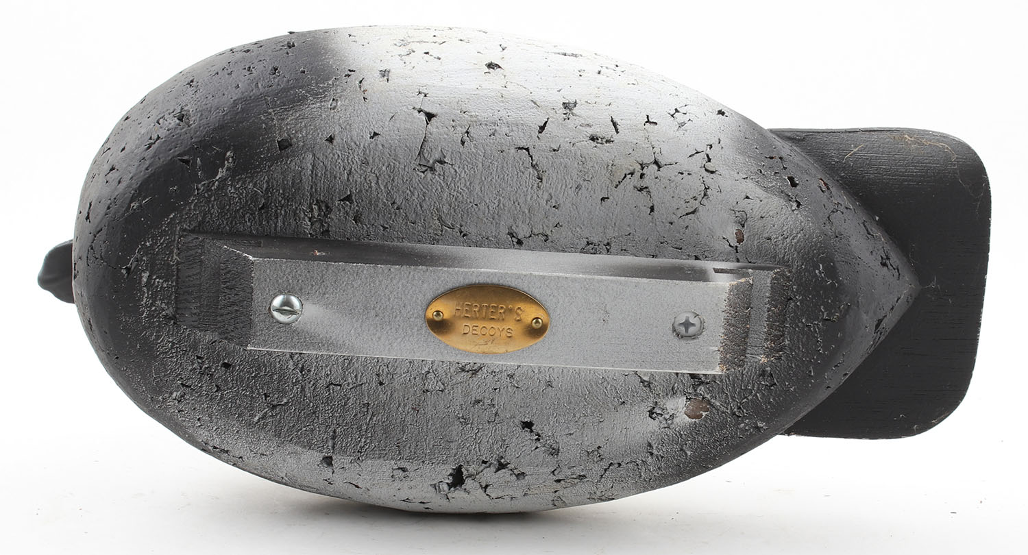 Bluebill Drake by Herter's Decoys, Waseca, MN, raised painted eyes, cork body, original paint, structurally excellent, 16'' OAL. Grade: Excellent - Value: 20 to 200