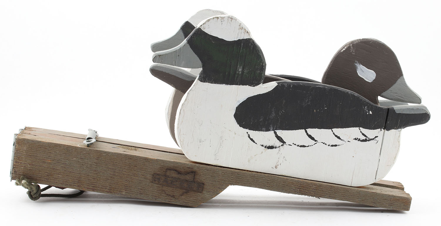 Tri-Folding Bluebill Decoys by Hackey, no eyes, all wood, original paint, marked on multiple surfaces, 18'' x 9'' OAL. Grade: Excellent - Value: 50 to 150