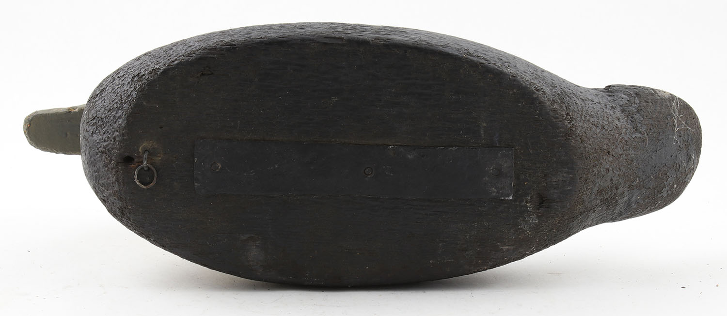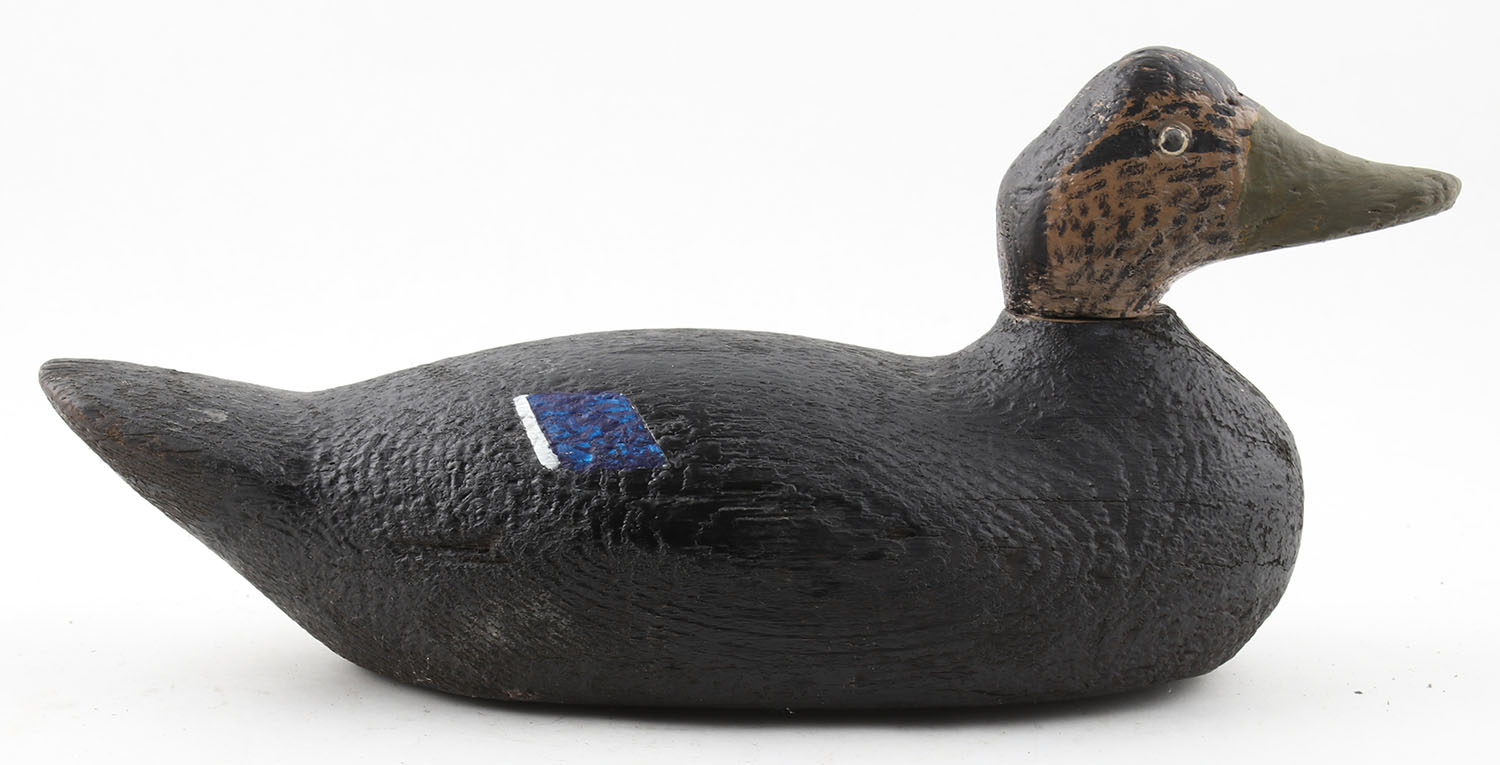 Black Duck by Unknown Maker, raised painted eyes, solid wood, repaint, structurally sound, some cracks at breast, 15 1/2'' OAL. Grade: Very Good - Value: 30 to 60