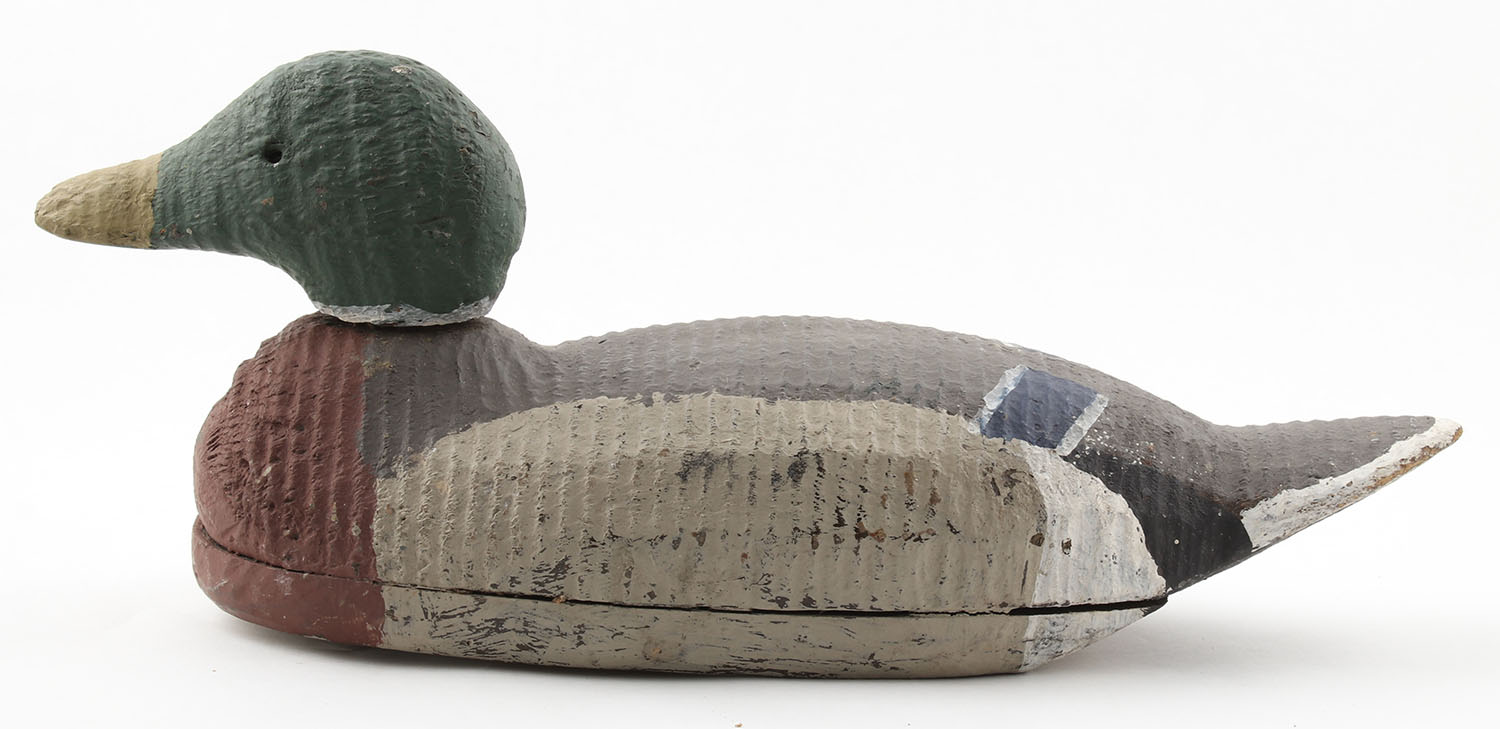 Mallard Drake by Gib Anderson, no eyes, solid lathed wood, original paint, structurally sound, head spins freely on dowel, 16'' OAL. Grade: Good ++ - Value: 20 to 40