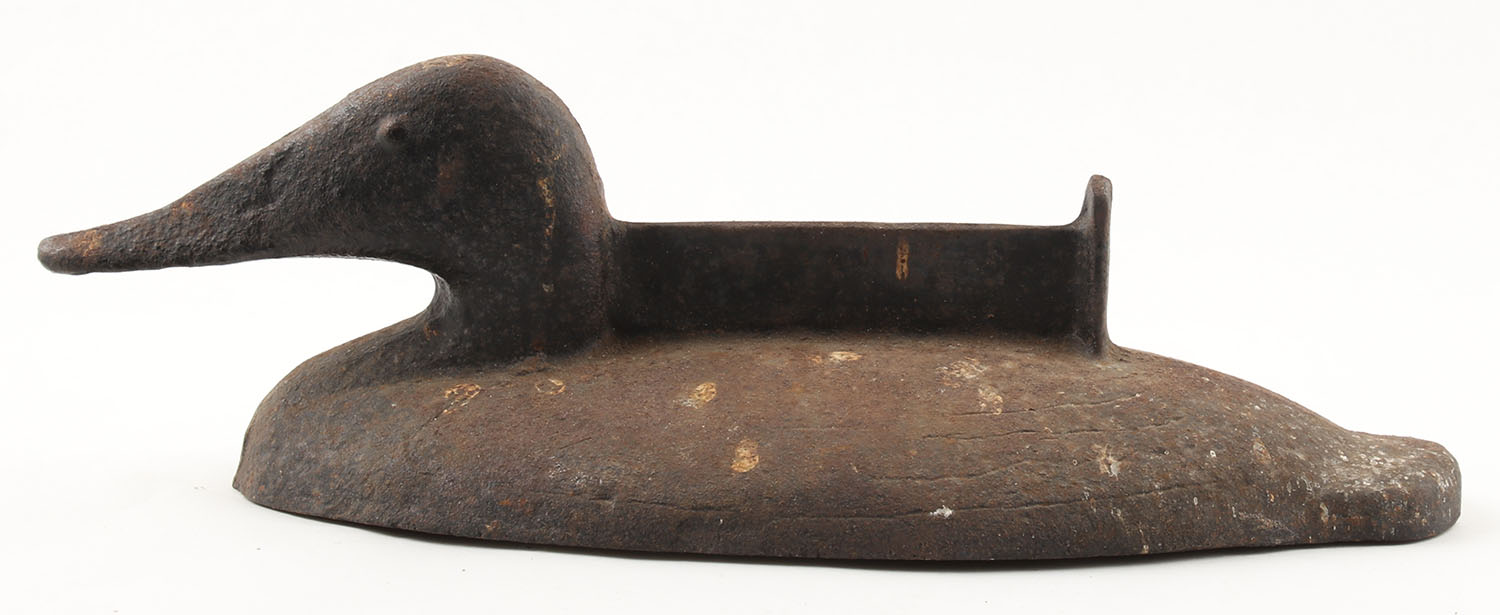 Weighted Decoy for Sink Boat, originally a weighted decoy for a sink boat, this decoy has had a piece of metal welded to the top to be used as a boot scraper, weighs 20 lbs, 15'' OAL. Grade: Good - Value: 10 to 50