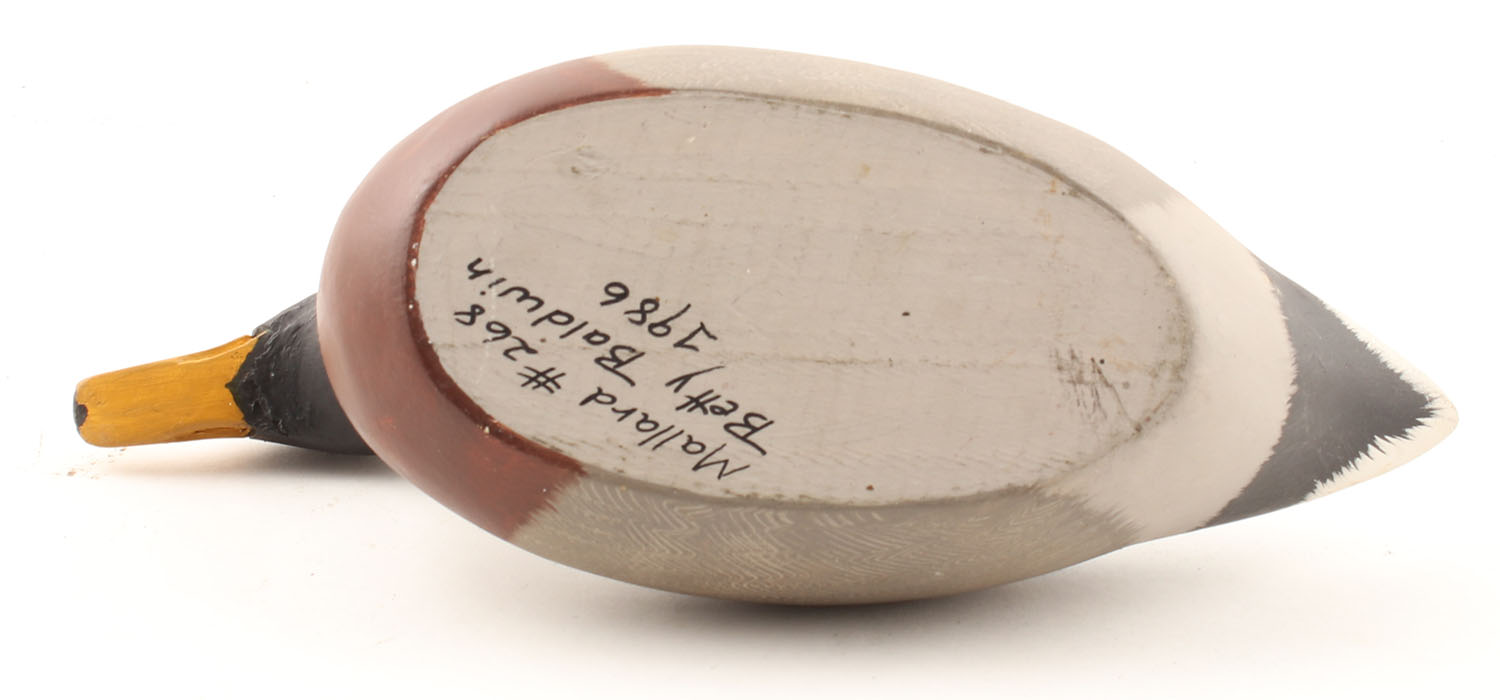 Miniature Mallard Drake by Betty Baldwin, 1986, glass eyes, sold wood, original paint, structurally excellent, signed on bottom, 10'' OAL - Value: 10 to 50