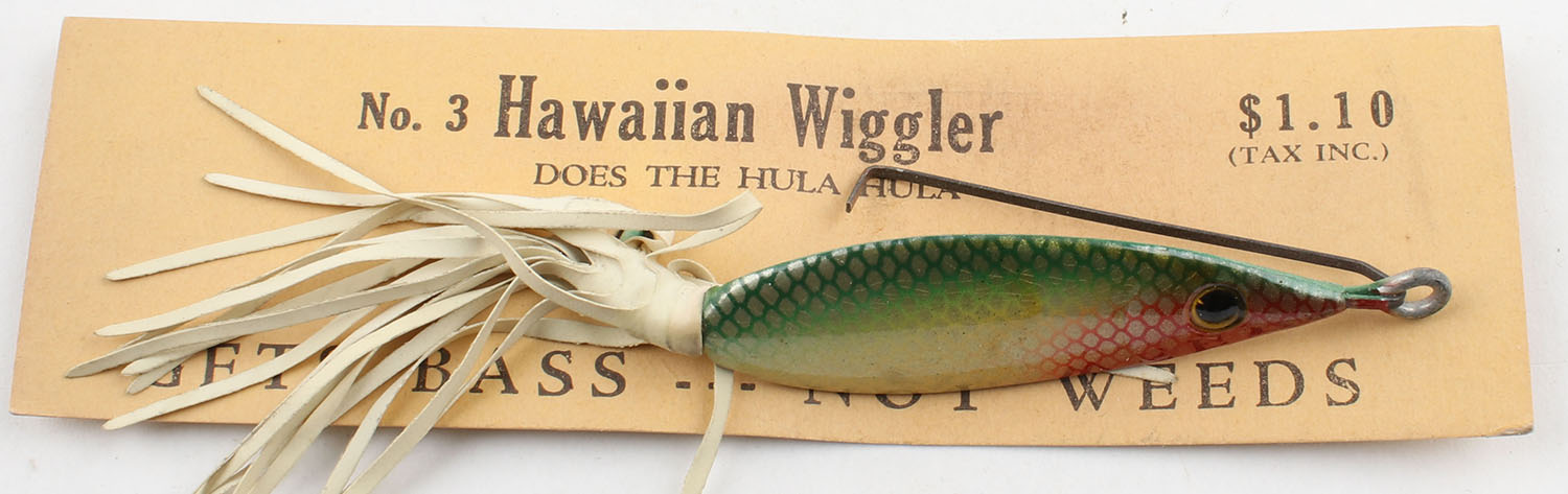 BOXED, Fred Arbogast, Hawaiian Wiggler No. 3, metal lure, PE, red/silver/green, single hook, weed guard, attached to original cardboard, rubber skirt excellent, 2 3/4'' OAL. Grade: Excellent - Value: 4 to 40