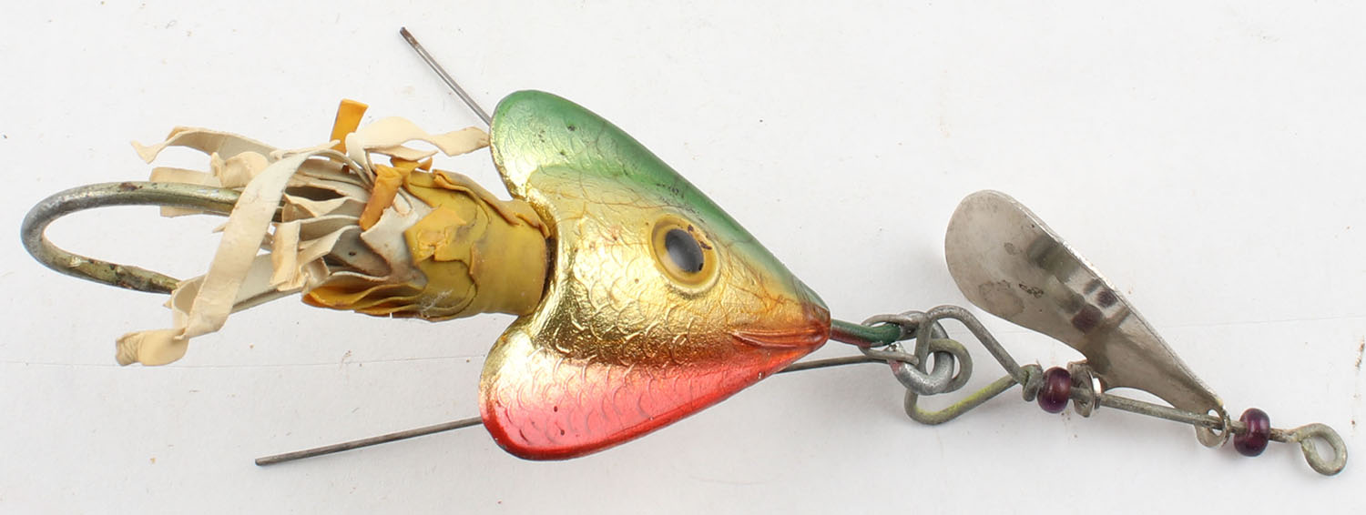 Fred Arbogast #2 Hawaiian, metal lure, PE, green/silver/red, single hook, spinning blade, weed guard, rubber skirt mostly gone, 3'' OAL. Grade: Very Good - Value: 2 to 20