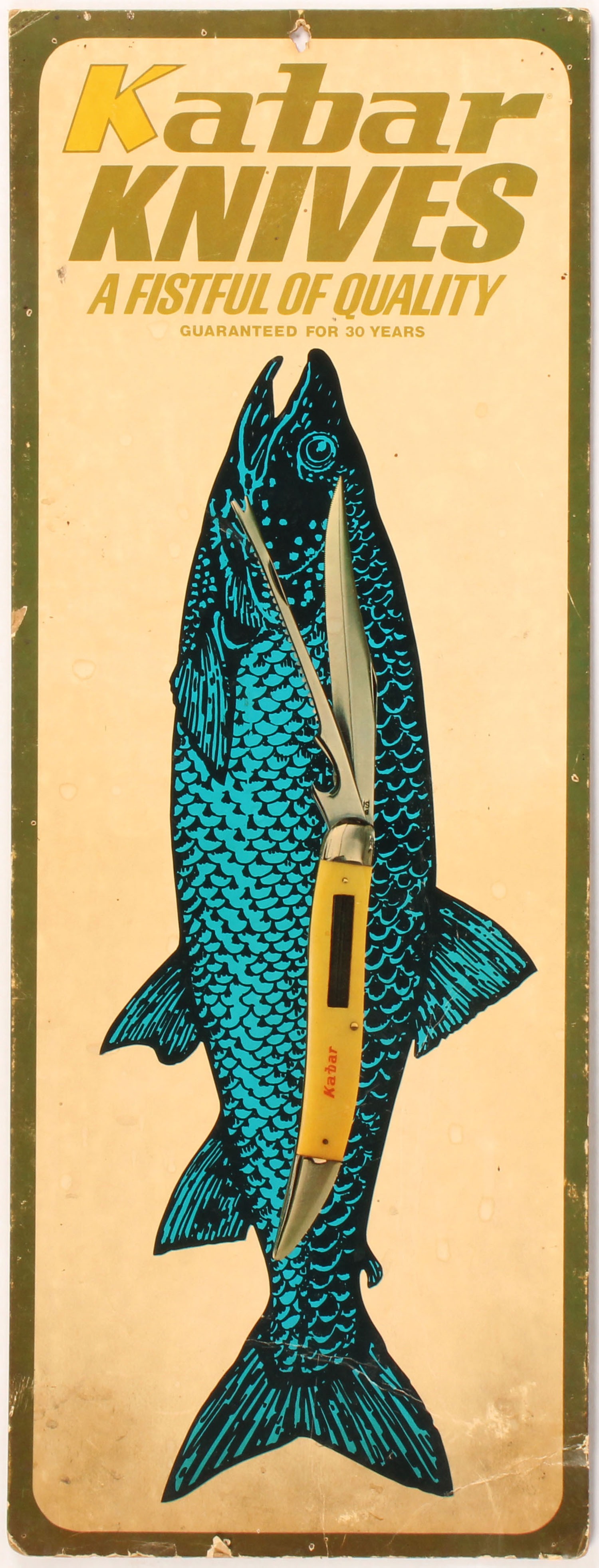 Kabar Knives Two-Sided Hanging Sign, one side pictures a blue fish, with an open Kabar folding knife, displaying the two styles of blades, on the other side is a multicolor image of bull moose, with a Kabar fixed blade knife, some age soiling & staining to the bottom, edge & corner wear, one corner has a crease, 8 1/2'' x 22 1/2''. Grade: Good ++ - Value: 20 to 80