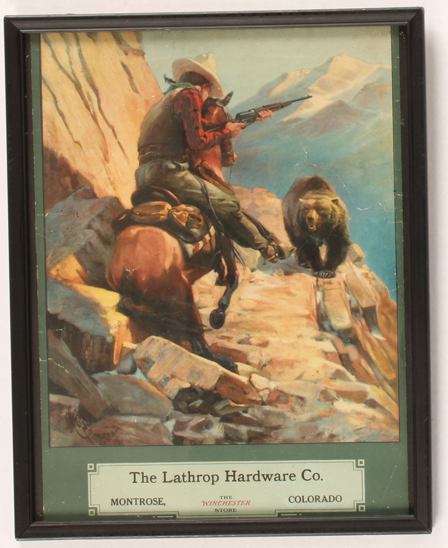 The Lathrop Hardware Co. Store Calendar Top, 1922, pictures a full color image of a man on horseback holding a Winchester 1895 Carbine running into a grizzly on a mountain side trail, has some light staining & spotting, a few tears along the edges, good colors, 14'' x 10'', framed. Grade: Fair ++ - Value: 50 to 200