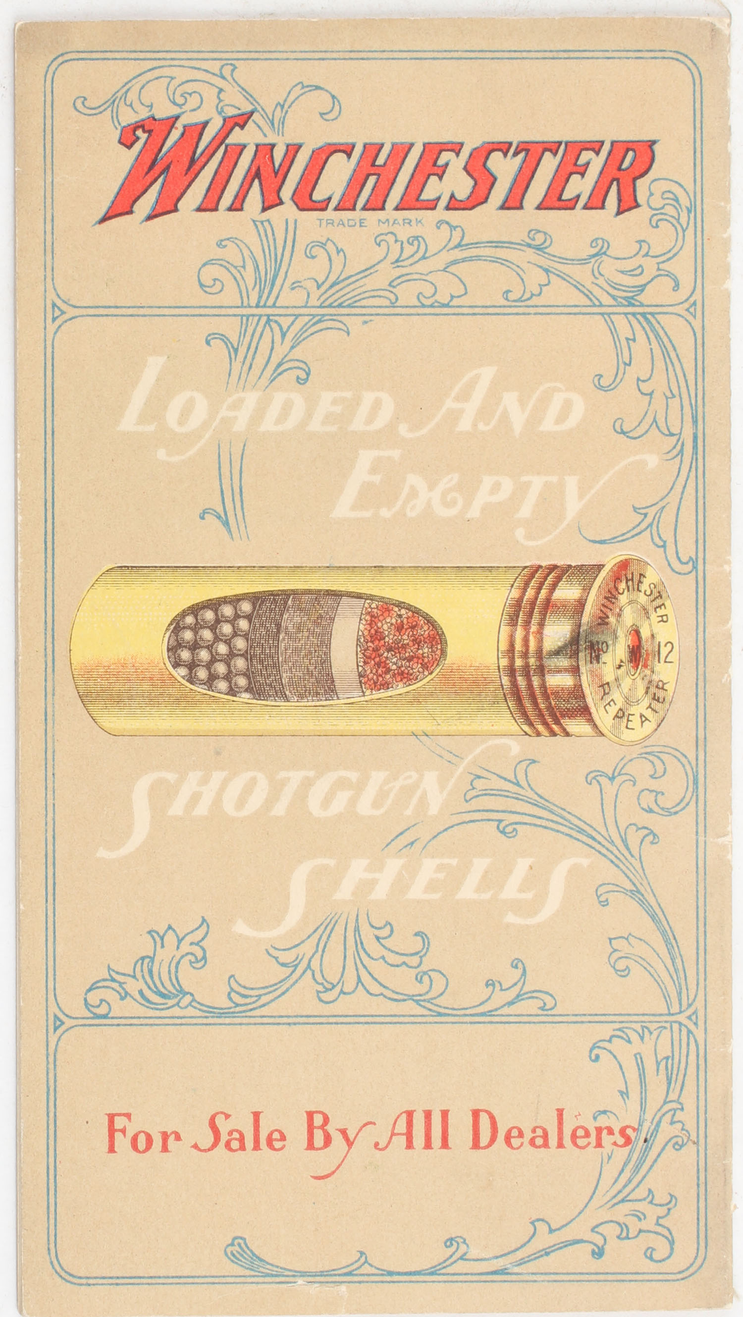 Winchester Booklet, ''LOADED AND EMPTY SHOTGUN SHELLS'' pictures a red leader shotshell on the front cover, a yellow Repeater shotshell on the back, with full color images of shotshells on the inside along with red & black text. Grade: Excellent - Value: 40 to 100
