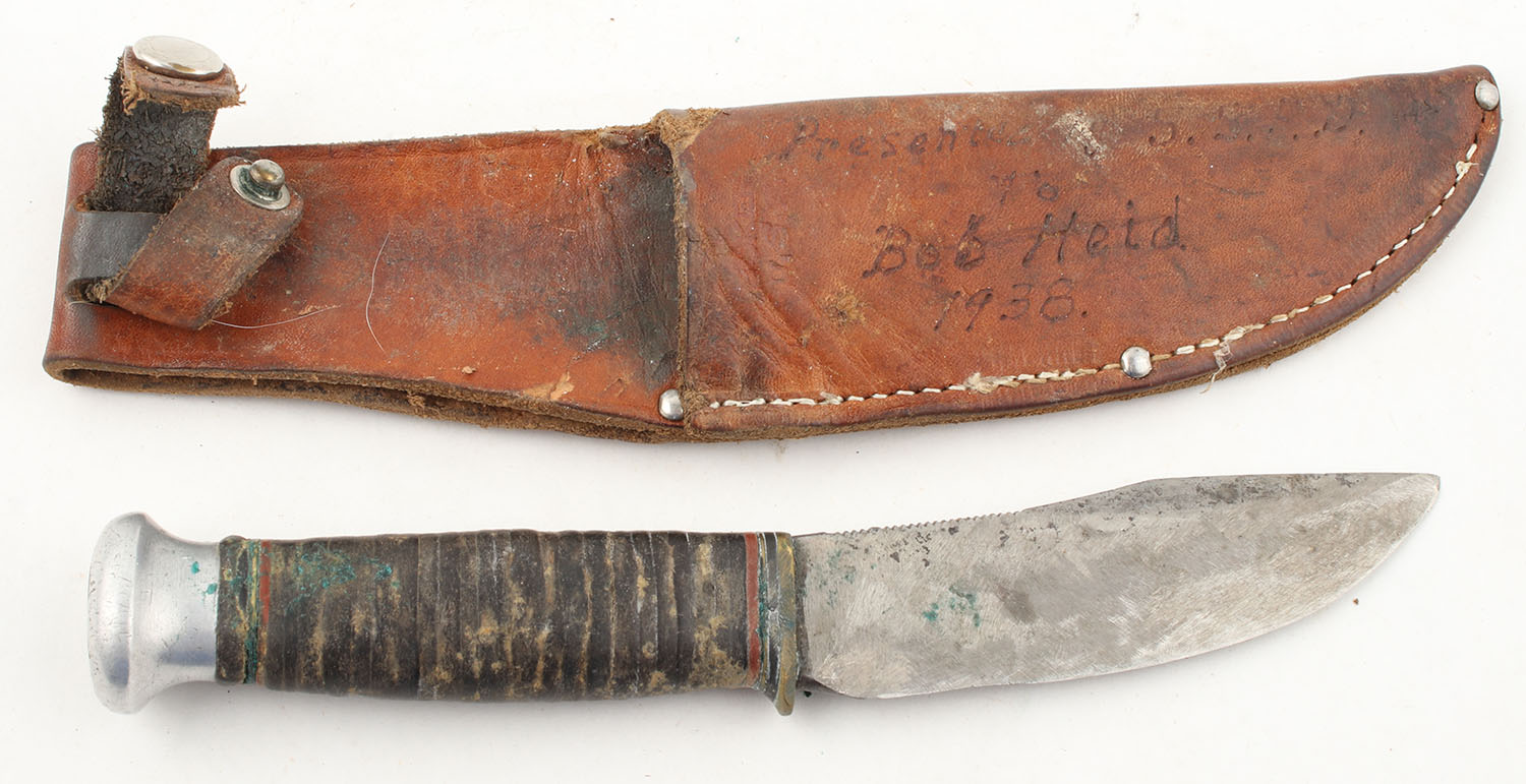 Marbles fixed blade knife, in non-original leather sheath, 5'' blade, leather handle with aluminum pommel, has age soiling and scuffing to blade. Grade: Very Good - Value: 20 to 80