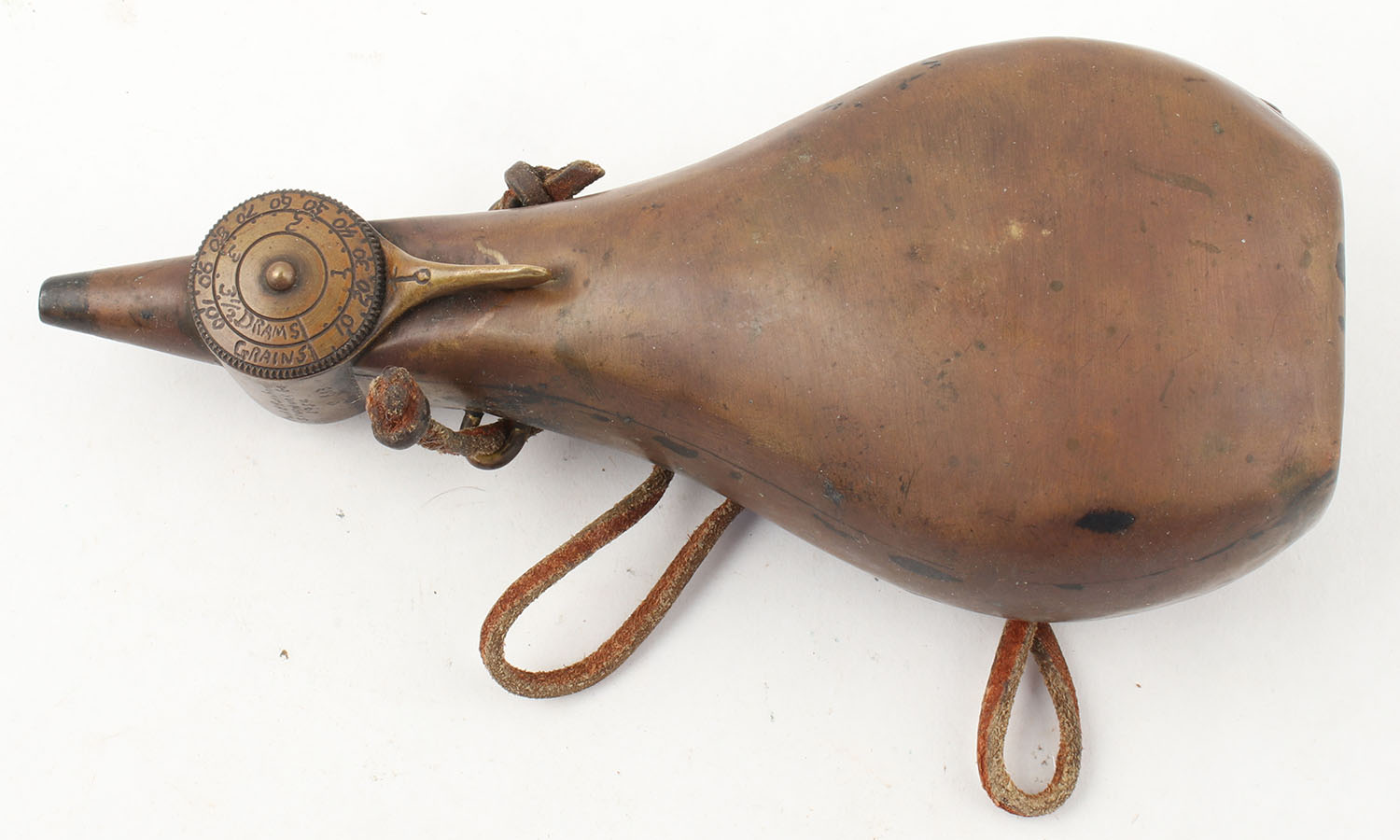 RARE! Mark B Burnham Brass powder flask, made in Savannah, Georgia, this flask dated 1954 and #613, has age soiling. Grade: Excellent - Value: 40 to 80
