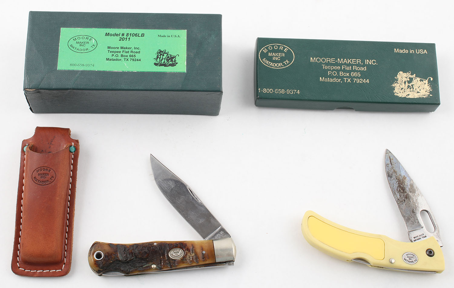 Lot of 2 Moore Maker Inc folding knives, in orignal boxes. Grade: Excellent ++ - Value: 50 to 150