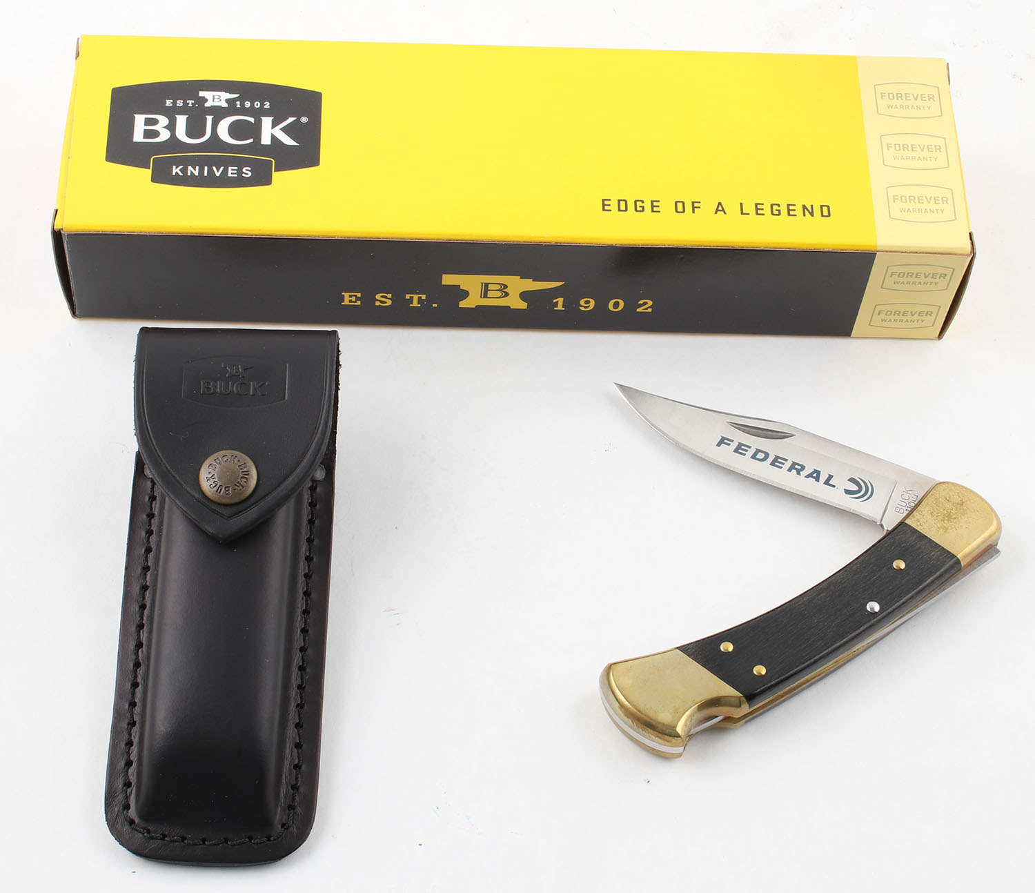 Buck folding blade knife, 3.5'' blade, in original box and leather sheath. Grade: Excellent ++ - Value: 40 to 80