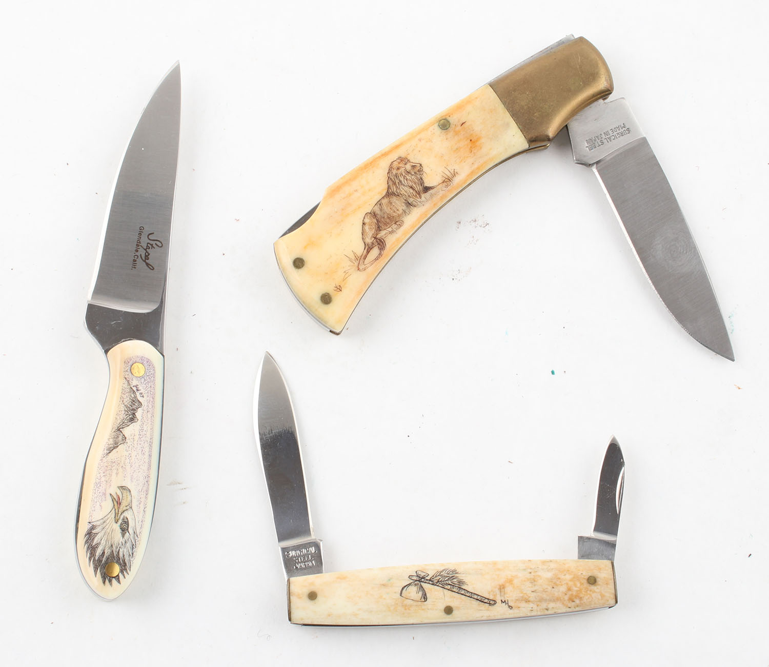 Lot of 3 Scrimshaw on bone knives, 2 folding and 1 fixed. Grade: Excellent ++ - Value: 50 to 100