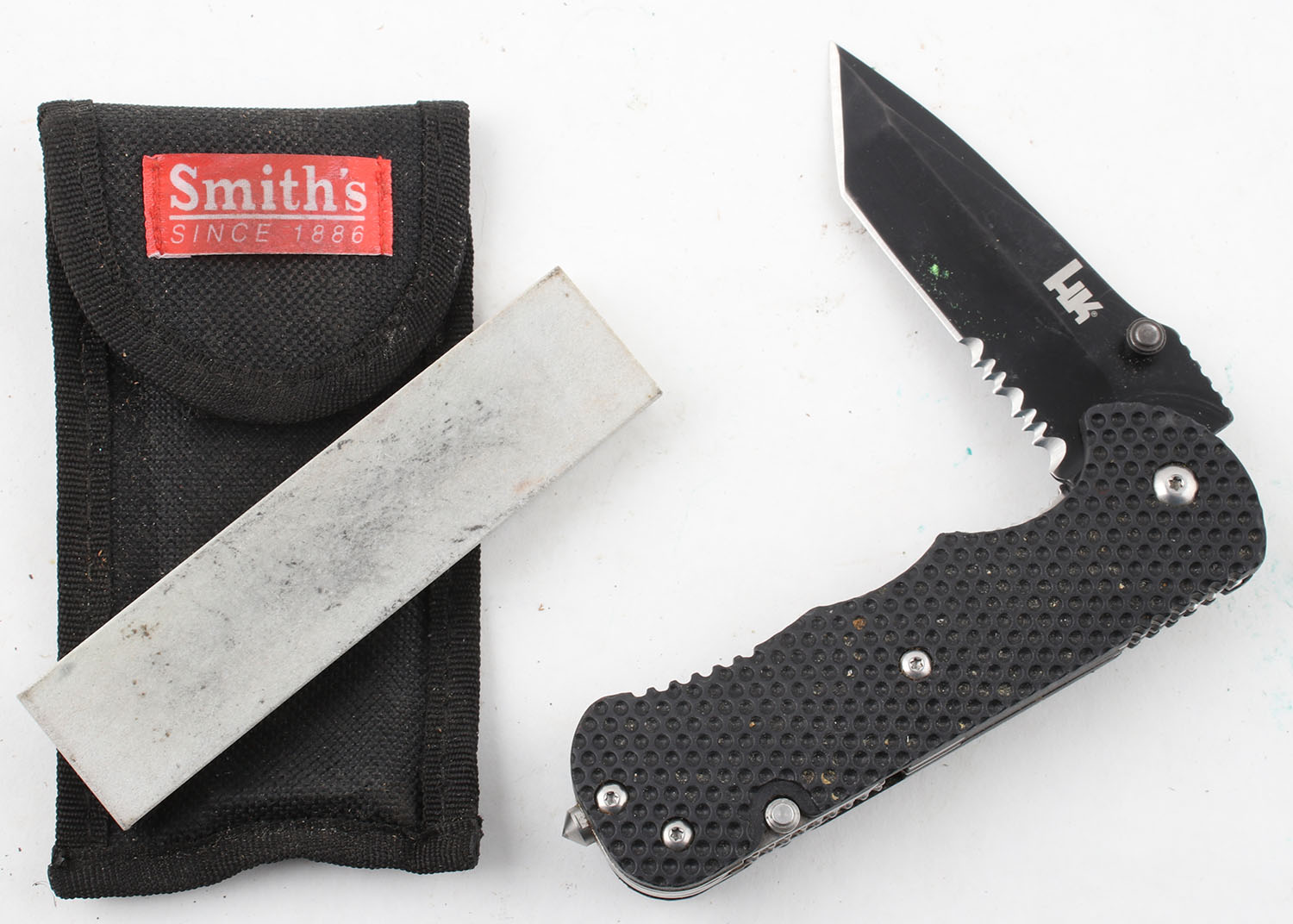 HK folding knife, 2.75'' blade, smooth to open, has sharpening stone. Grade: Excellent - Value: 10 to 60