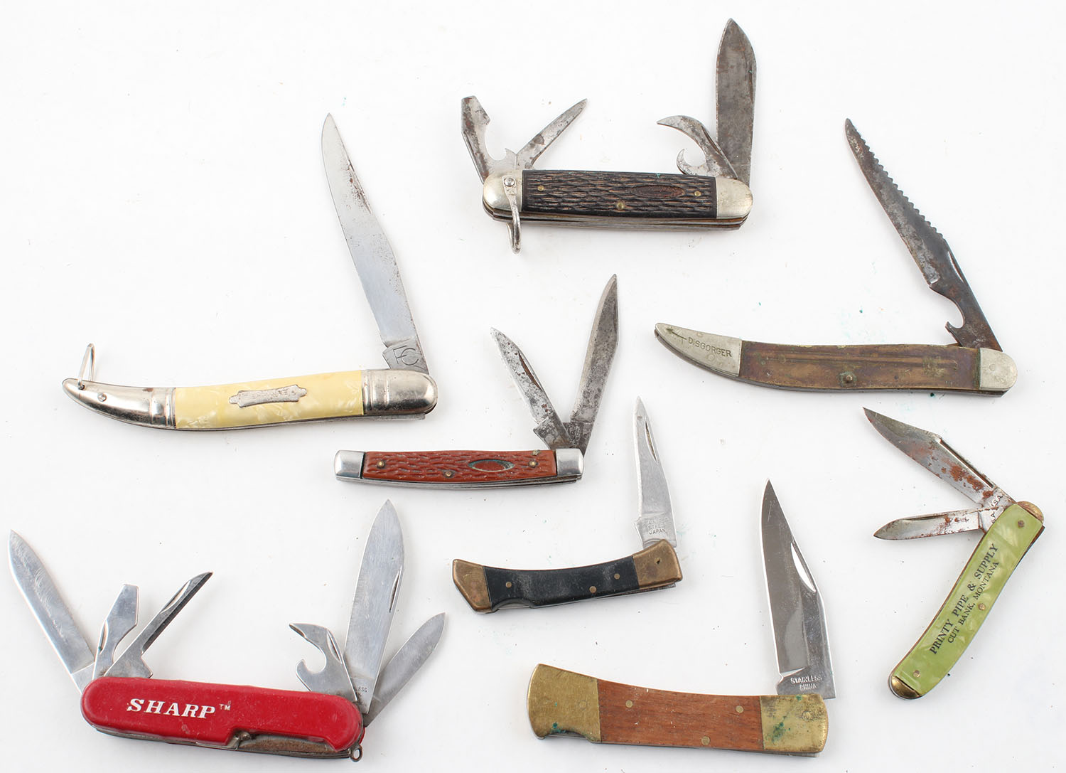 Lot of various folding knives, some age soiling. Grade: Excellent - Value: 20 to 100