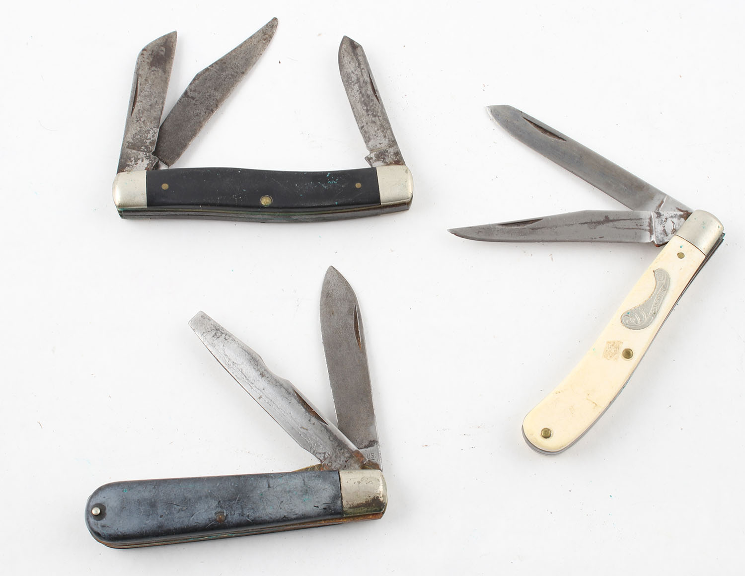 Lot of 3 folding blade knives, have age soiling. Grade: Very Good - Value: 8 to 50