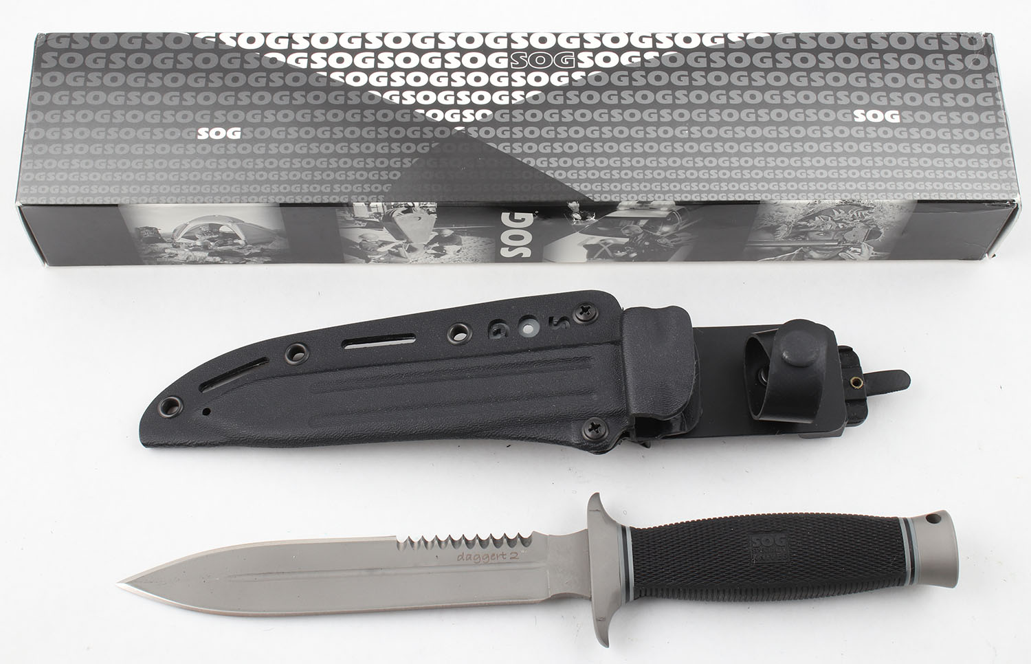 SOG knife, 6.5'' blade, has sheath and orignal cardboard box. Grade: Excellent ++ - Value: 20 to 80