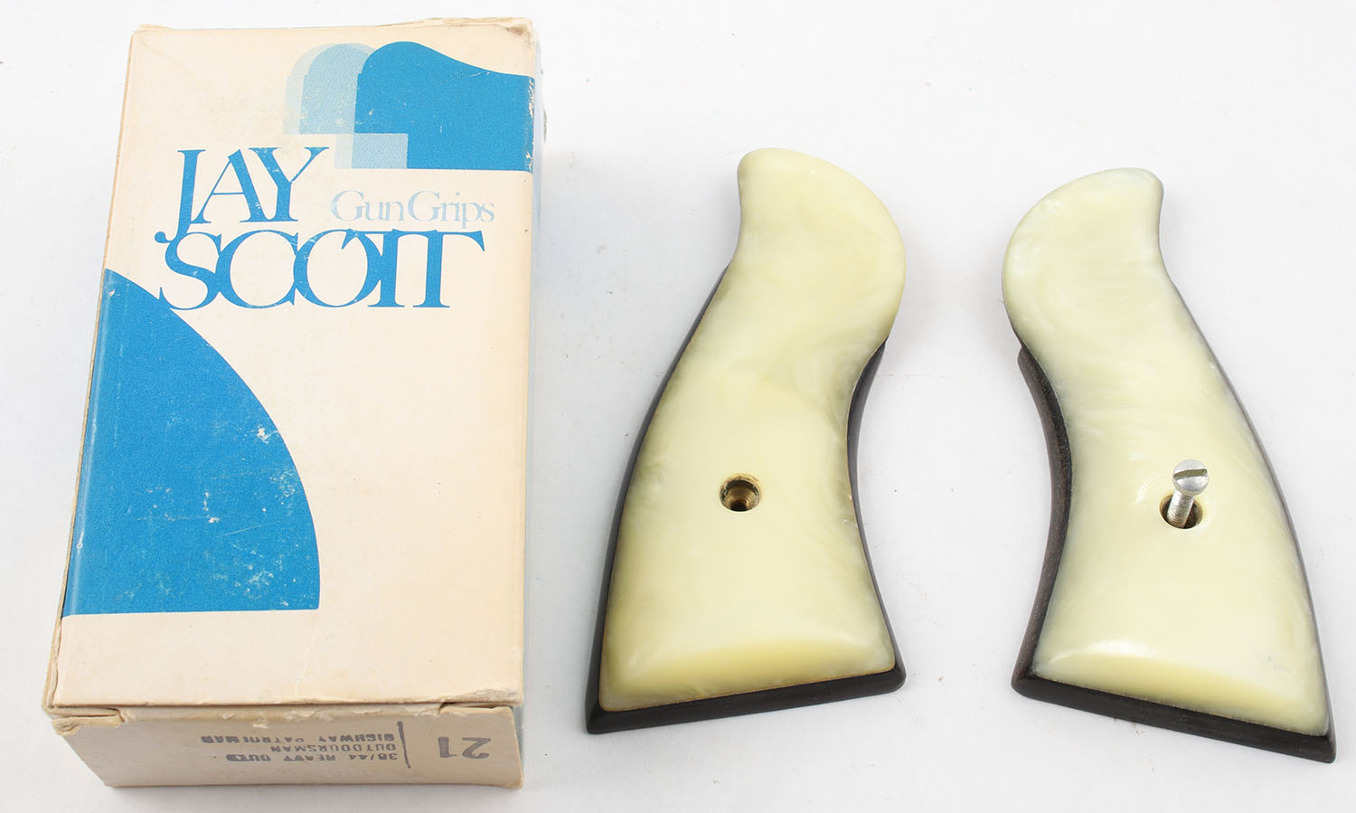 Jay Scott grips, 38/44 Outdoorsman Highway Patrolman, has screw, in original box. Grade: Excellent - Value: 16 to 90