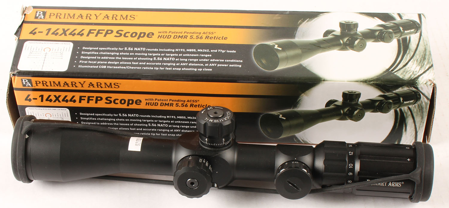 Primary arms 4-14x44 FFP rifle scope, in original box. Grade: Excellent ++ - Value: 50 to 150