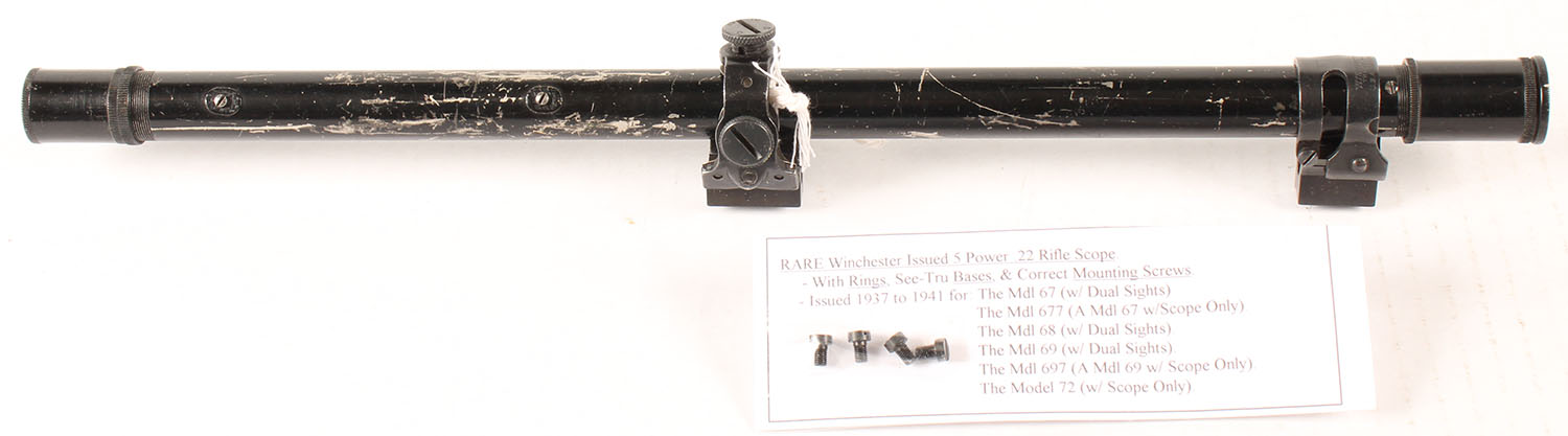 RARE! Winchester Issued Factory 5x .22 Rifle scope, with Winchester rings, see-thru bases & correct mounting screws, issued 1937-1941 for M 67(dual sights), M 677(a scoped 67), M 68(dual sights), M 69(dual sights), M 697( scoped 69) and M 72(scope only), show wear and scuffing, fine cross hairs with clear view! Grade: Very Good ++ - Value: 100 to 500