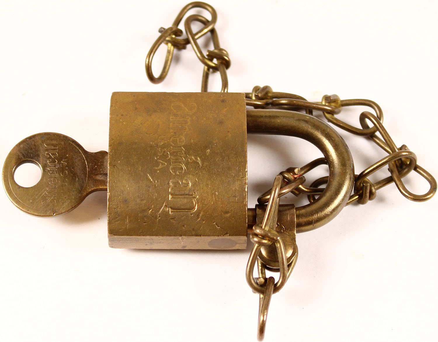 Antique ''American US'' brass padlock, has key. Grade: Very Good ++ - Value: 20 to 100