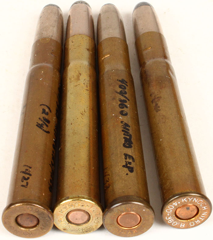 Lot of 4. 400/360 x 2.75'' Nitro Express. All by Kynoch. (HS=''KYNOCH 400/360'', cn rn sp. (1) HS=''KYNOCH NITRO .400-360'', rn cn sp. (1) HS=''KYNOCH NITRO .400-360B'', cn rn sp. (1) HS='' KYNOCH 400/360 NITRO'', cn rn sp. Grade: Excellent - Value: 20 to 70