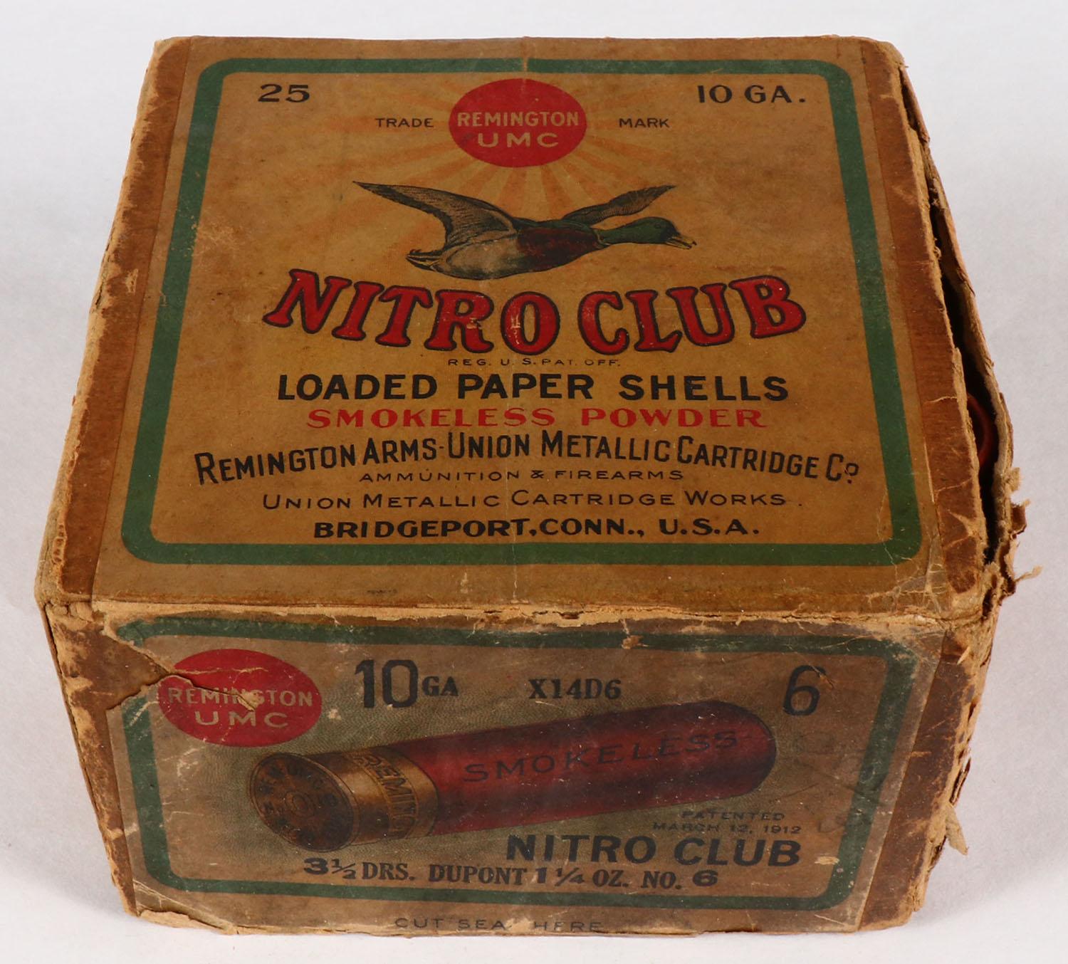Remington UMC, Nitro Club, 10ga., 2pc., Full, Loading: 3 1/2 Drs. 1 1/4 Oz., shot size 6, buff box with sunburst logo & Mallard flying on top, box has age soiling & scuffing, has edge wear with a seam split, paper shells are excellent. Grade: Very Good - Value: 100 to 400