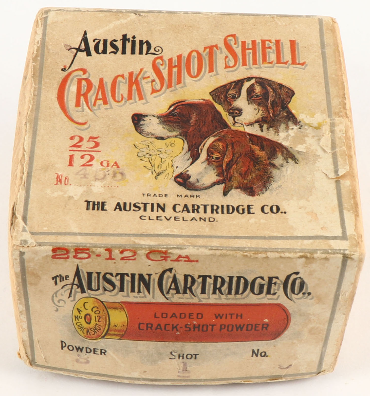 The Austin Cartridge Co., Crack-Shot Shell, Empty, shot size 1, incorrect bottom, buff box with multi colored label pictures dog on top, a shell on one side & black print on other side, box has age soiling with light scuffing. Grade: Very Good - Value: 100 to 400