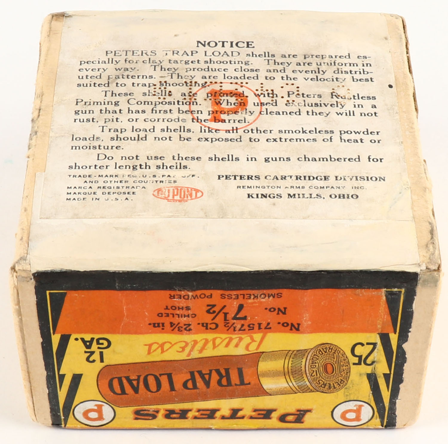 Peters Cart. Co., TRAP LOAD, 12ga., 2 3/4'', 2pc., FULL & SEALED, ''HALLOWEEN BOX'' buff box with orange, yellow, white & black paper label, shot size 7 1/2 Ch., box has been professionally restored, box is very solid with excellent colors. Grade: Excellent + - Value: 500 to 2500