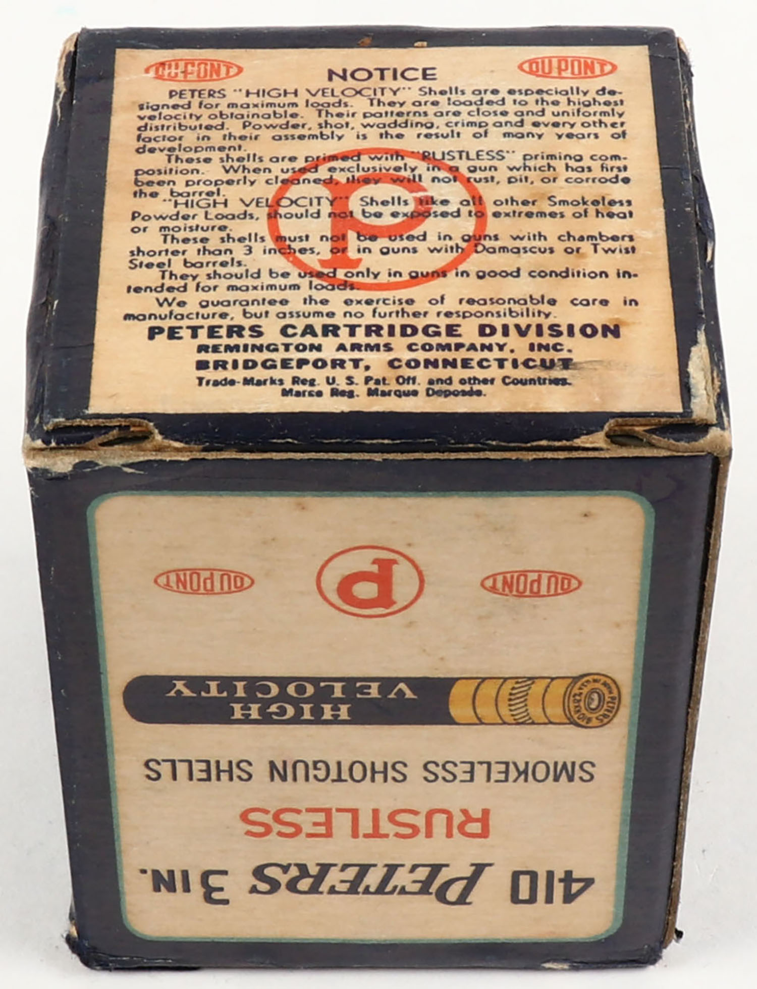 Peters, High Velocity, 410ga., 3 in., 1pc., Full, shot size 7 1/2, multi-colored box with mallard duck flying out of marsh grass, box has light edge wear with excellent colors, shells are excellent. Grade: Very Good ++ - Value: 40 to 100
