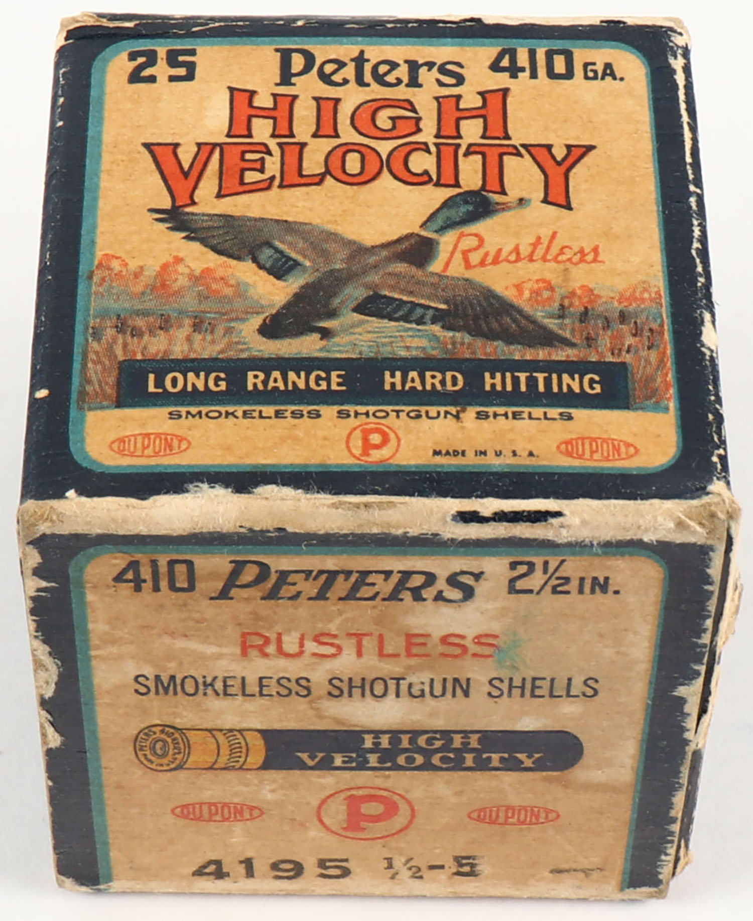 Peters, High Velocity, 410ga., 2 1/2'', 1pc., Full, shot size 5, multi-colored box with mallard duck flying out of marsh grass, box has edge wear with some age soiling, paper shells are excellent. Grade: Very Good + - Value: 40 to 100