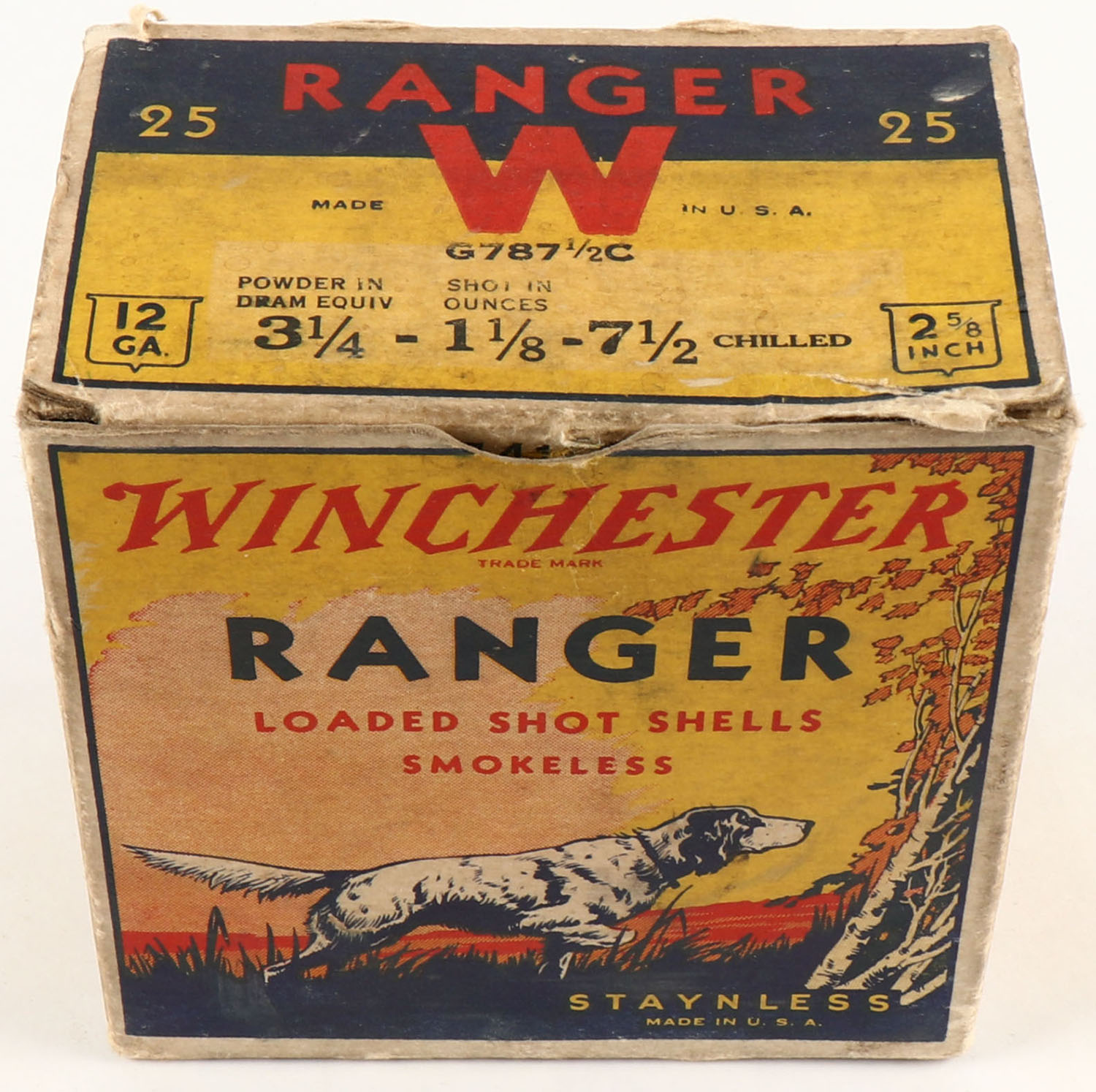 Winchester, Ranger, 12ga, 1pc., Empty, Shot Size 7 1/2 Chilled, multi colored box, dog on point, 2 5/8'', box has light scuffing with very nice colors. Grade: Very Good ++ - Value: 20 to 60