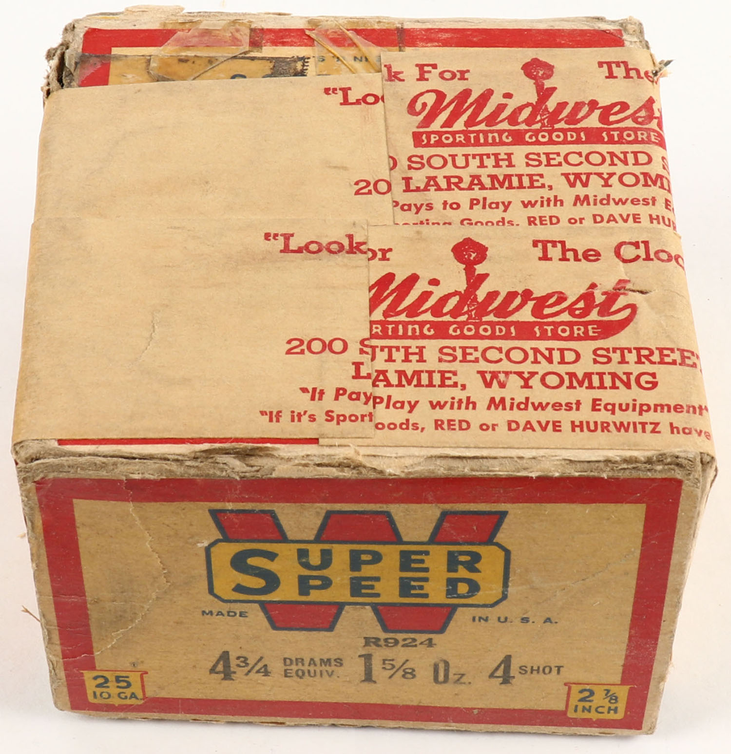Winchester, Super W Speed, Staynless, 10ga., 2 7/8'', 1pc., Partial 24rds, shot size 4, cream red, blue and yellow box, box has taped wrapped around it, has shell protrusions with wear, paper shells are excellent. Grade: Good ++ - Value: 10 to 40