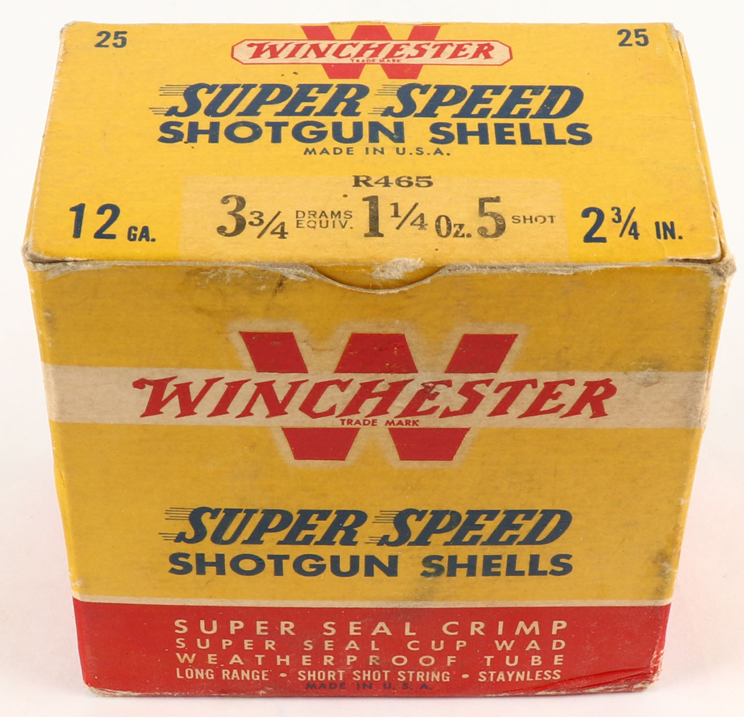 Winchester, Super Speed, 12ga., 2 3/4'', 1pc., Full, shot size 5, red, black and yellow box, box has light scuffing, paper shells are excellent. Grade: Excellent - Value: 10 to 40
