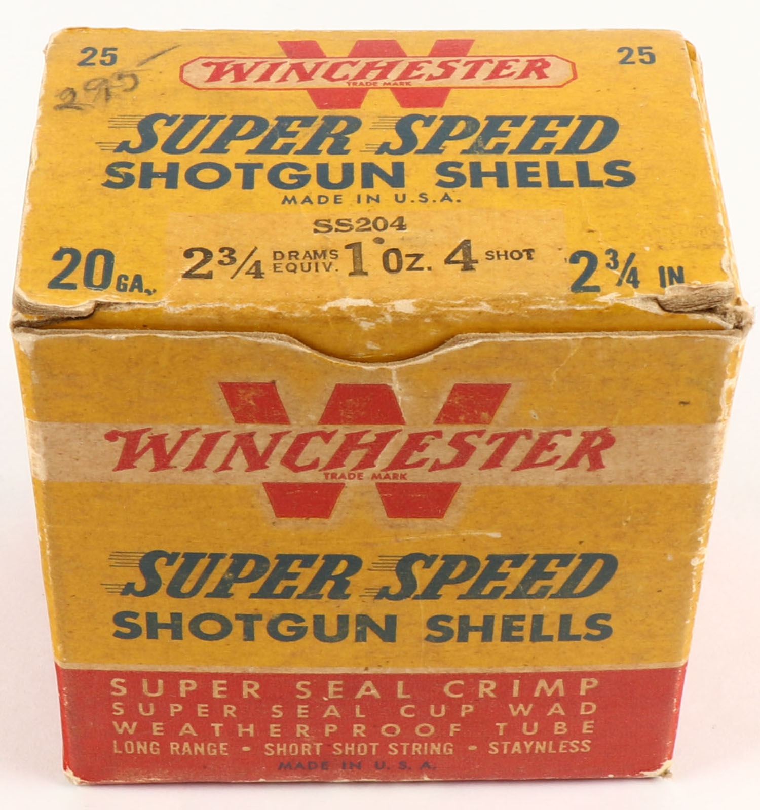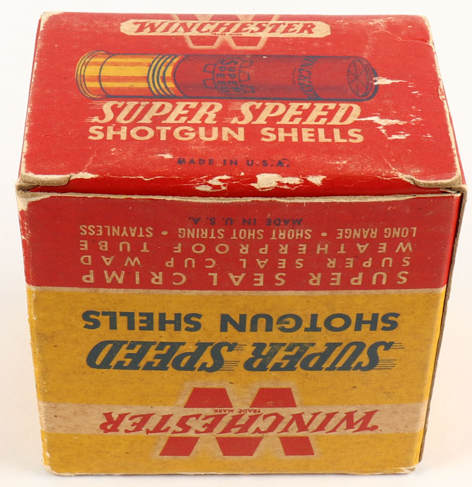 Winchester, Super Speed, 20ga., 1pc., Partial 18rds, 2 3/4'', shot size 4, red, yellow & blue box, box has scuffing, paper shells are excellent. Grade: Very Good + - Value: 10 to 40