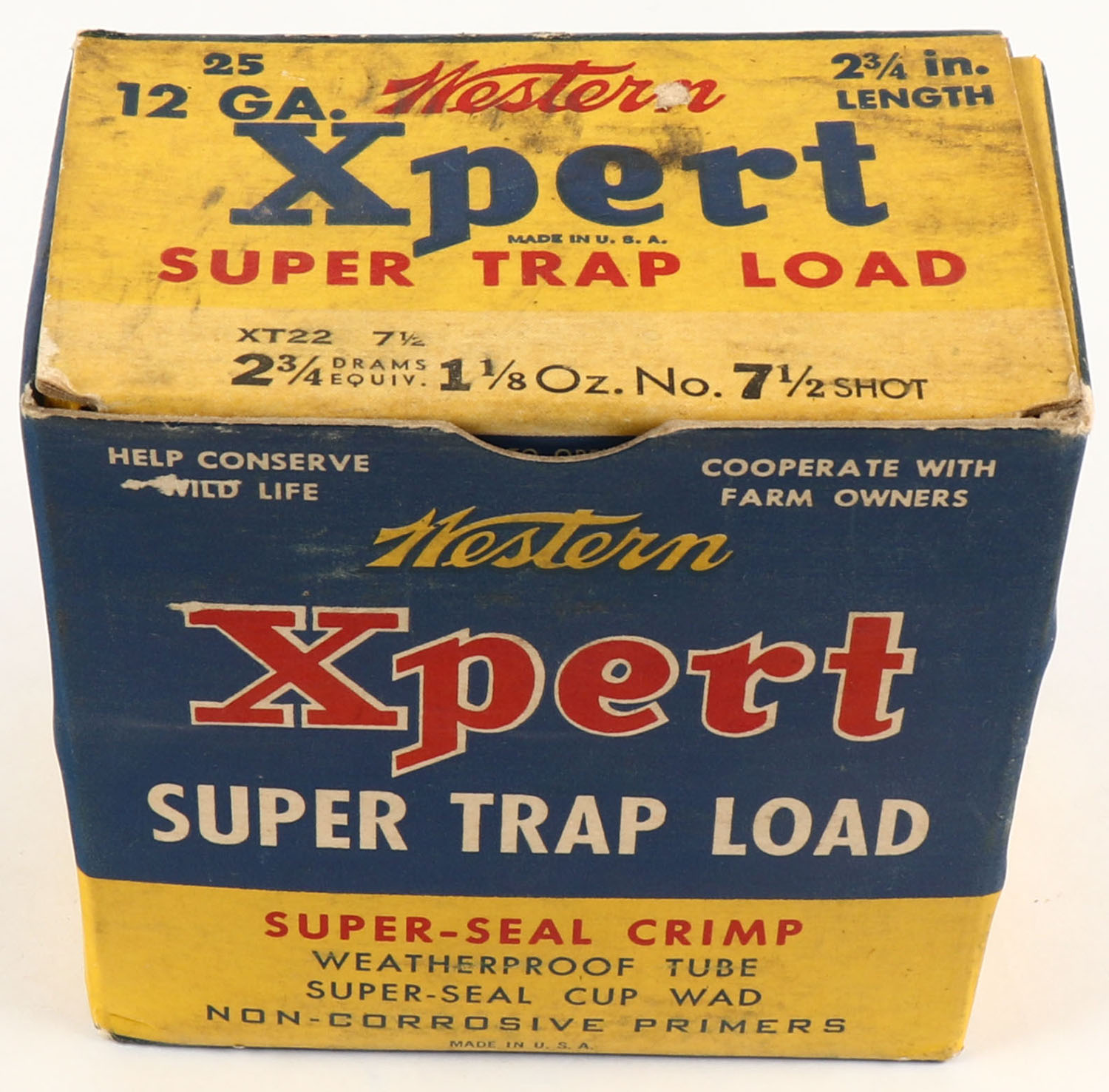 Western Xpert, Super Trap Load, 12ga., 1pc., Full, shot size 7 1/2, 2 3/4'', multi-colored box, box is very solid with light shelf wear and very nice color, paper shells are excellent. Grade: Excellent - Value: 10 to 30