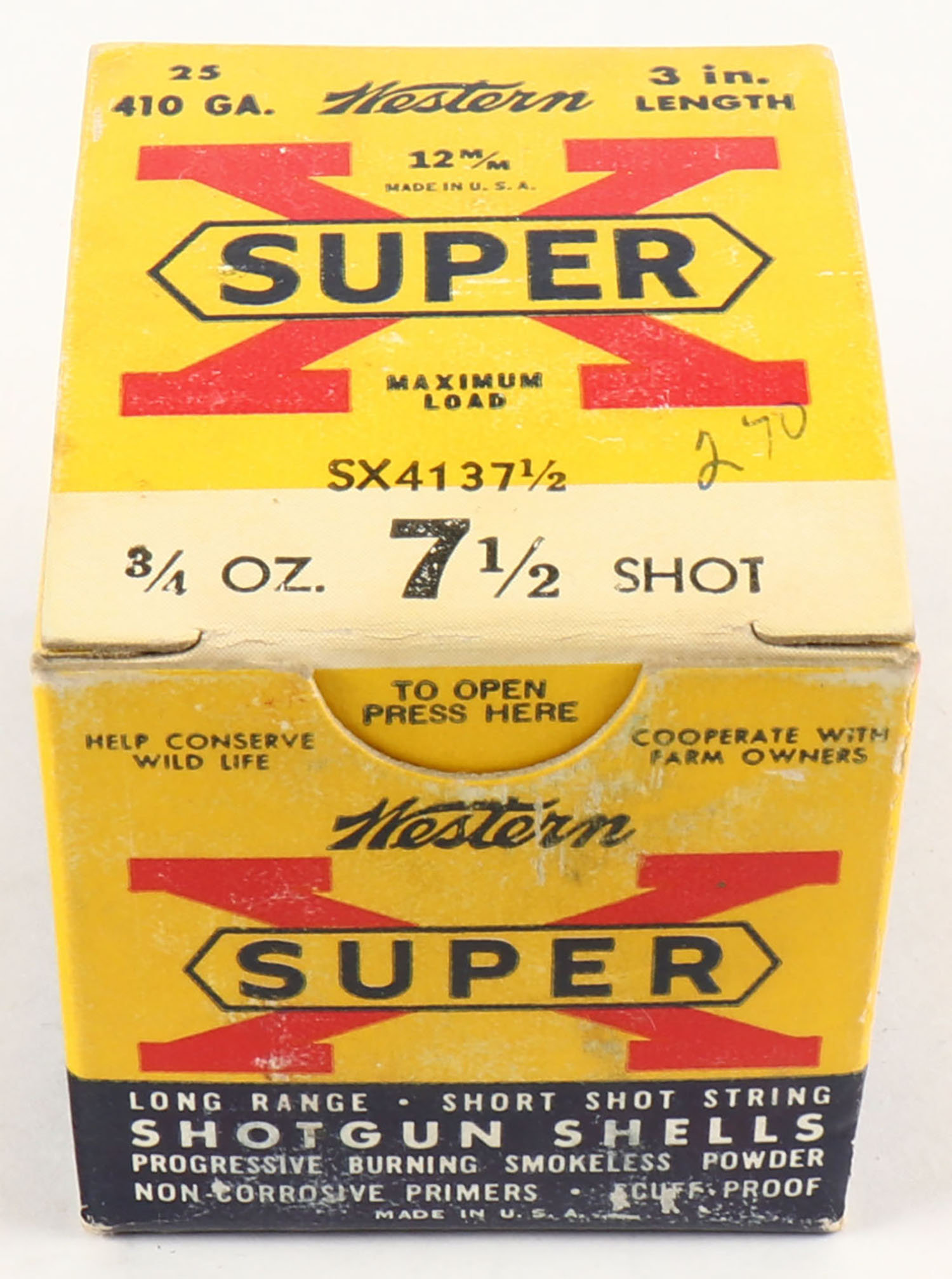Western, Super X, 410ga., 3'', 1pc., Full, shot size 7 1/2'', multi-colored box, box is very solid, paper shells are excellent. Grade: Excellent ++ - Value: 10 to 30