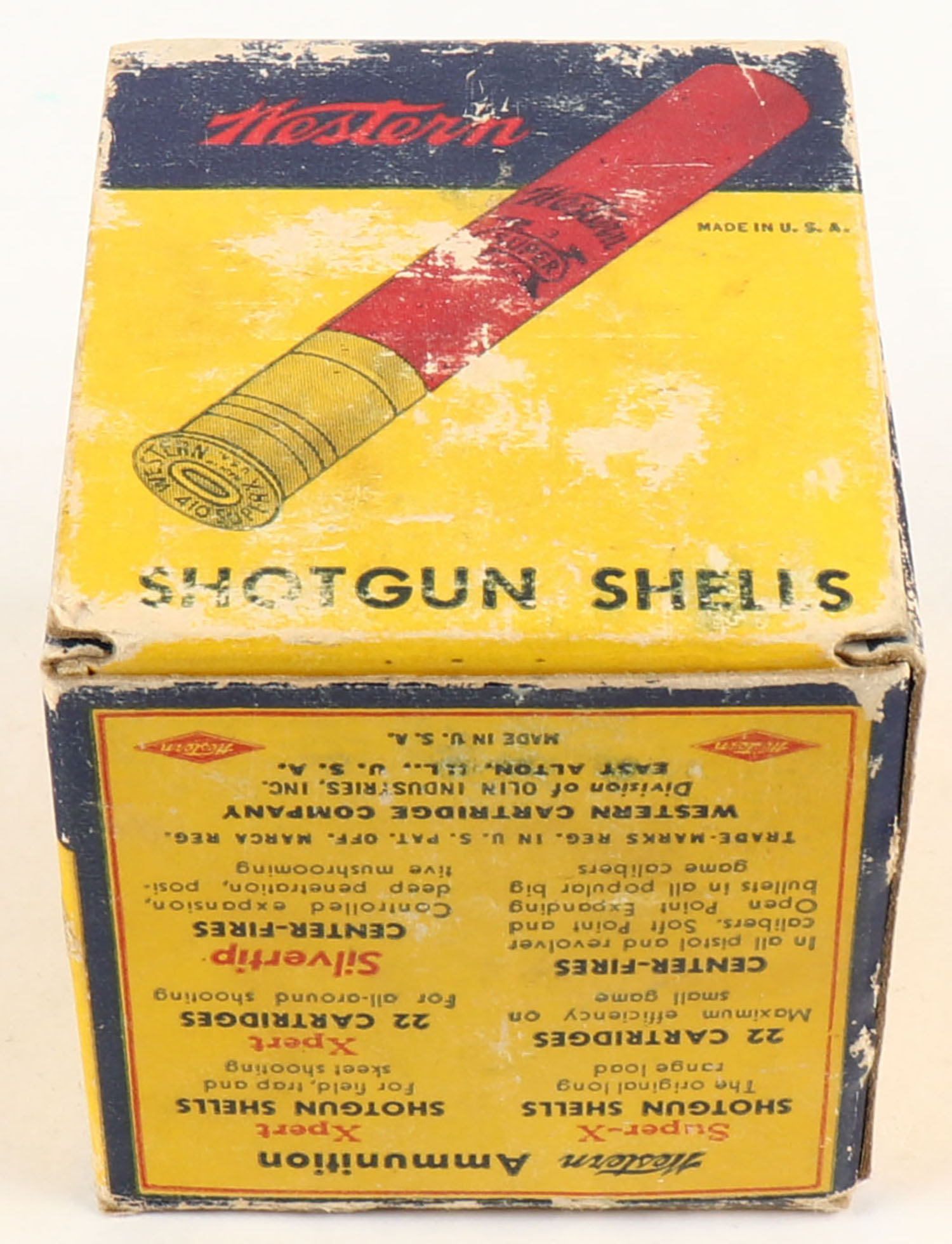 Western, Super X, 410ga., 3'', 1pc., Full, shot size 5, multi-colored box, box has light scuffing, paper shells are excellent. Grade: Very Good ++ - Value: 10 to 30