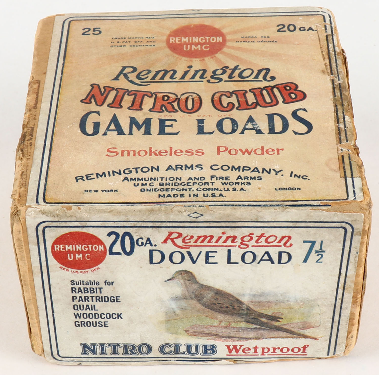 Remington UMC Nitro Club, GAME LOADS, DOVE LOAD, 20ga., 2pc., Full, shot size 7 1/2, buff box with sunburst logo & DOVE on side, box has repaired seam splits, box has age soiling & scuffing, paper shells are very good. Grade: Very Good - Value: 100 to 600